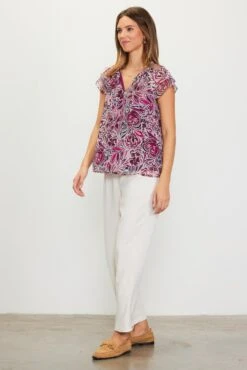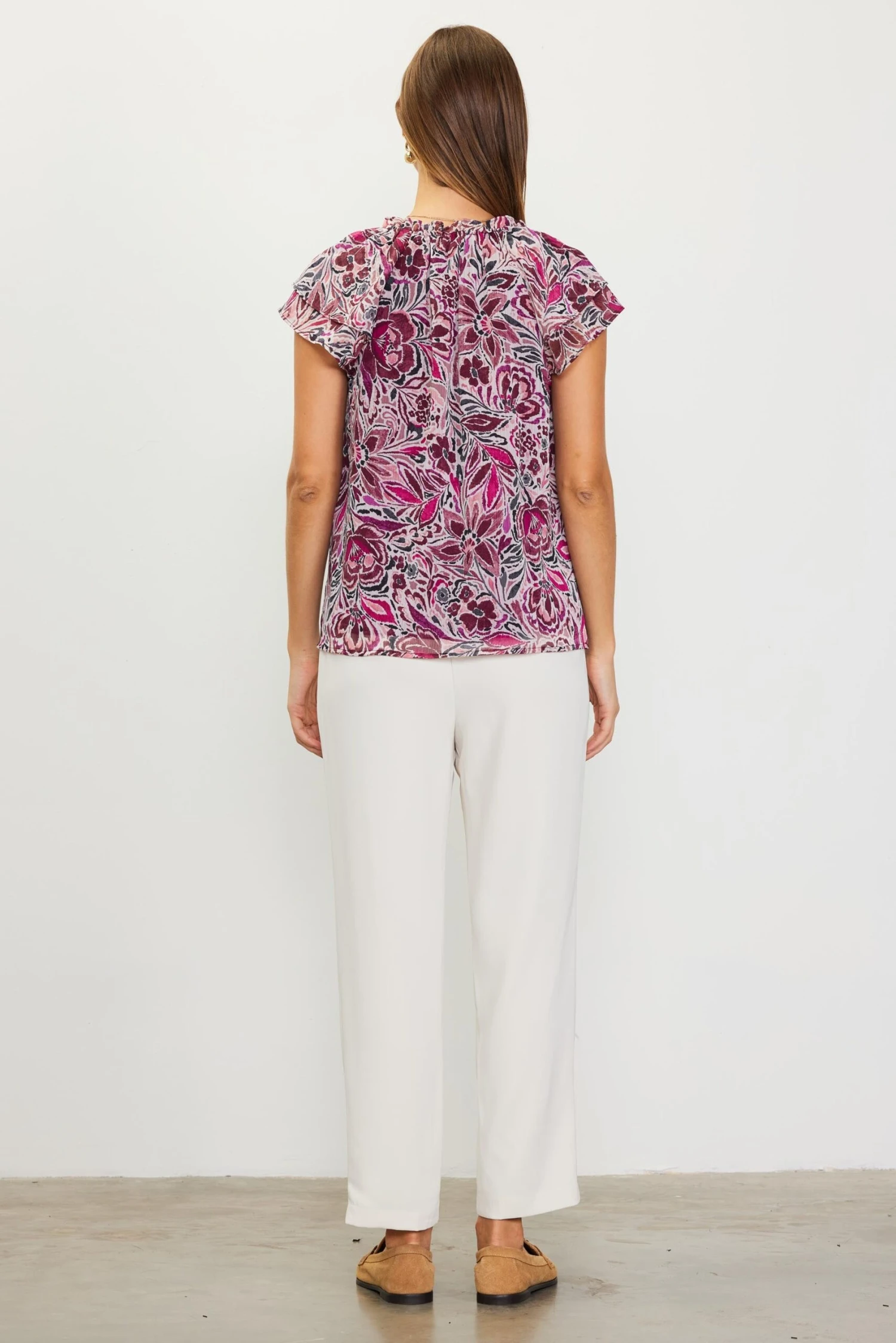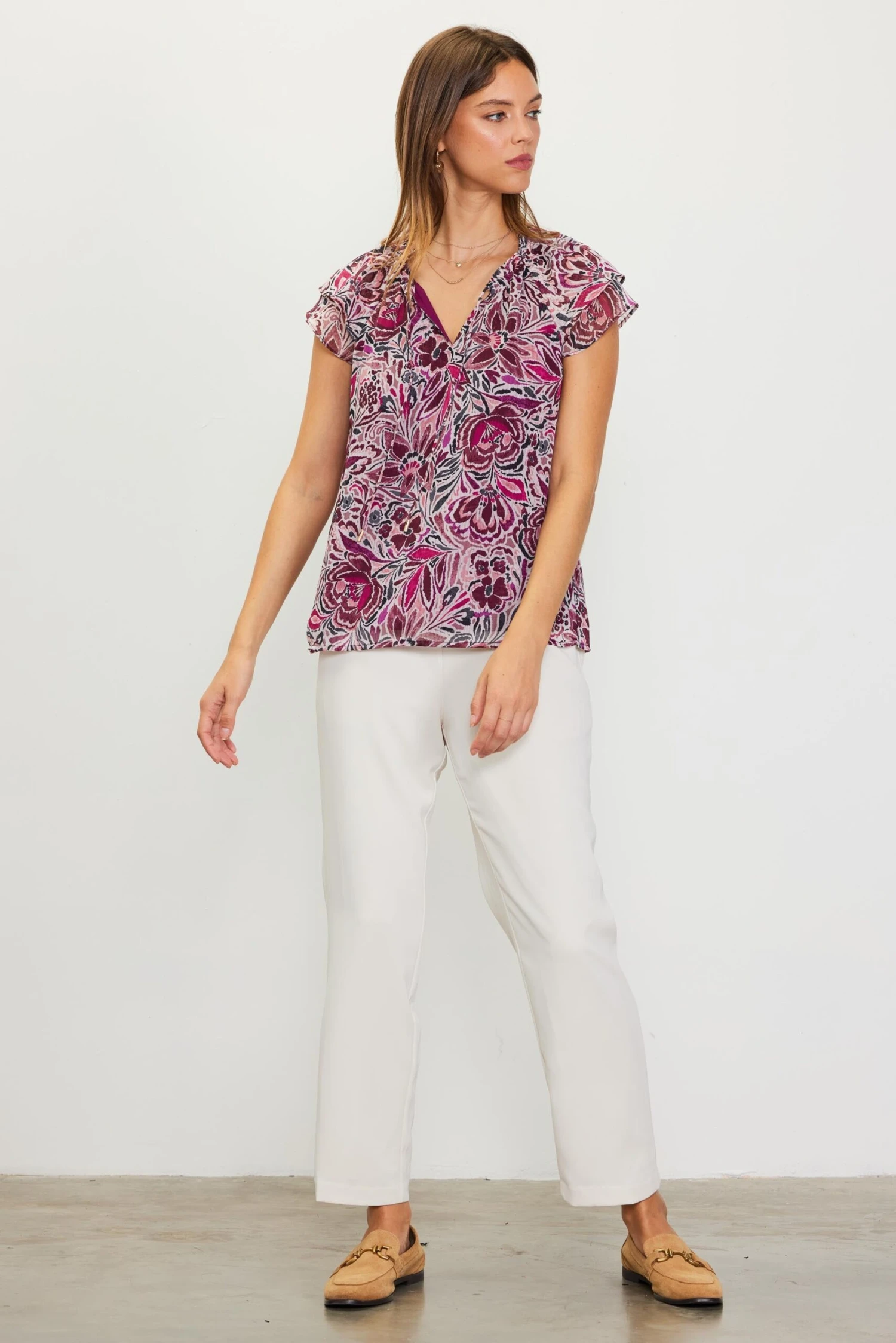 Decorated with a striking floral print, this semi-sheer top has a feminine vibe thanks to the tied neckline and tiered ruffle sleeves. So pretty.