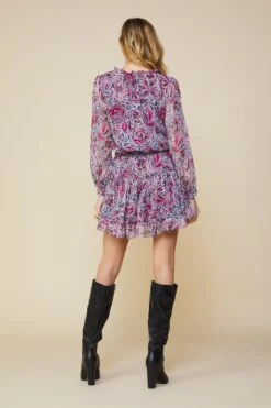 Mini dress, big mood. Featuring a stunning floral print with gleaming metallic threads woven in, this long-sleeve stunner features a self-tie neckline, smocking at the waist, and a tiered skirt with ruffle detailing.