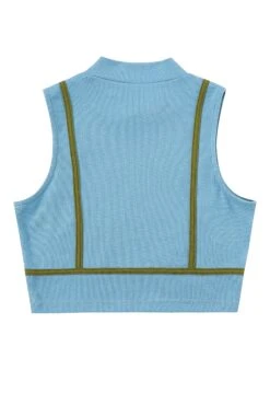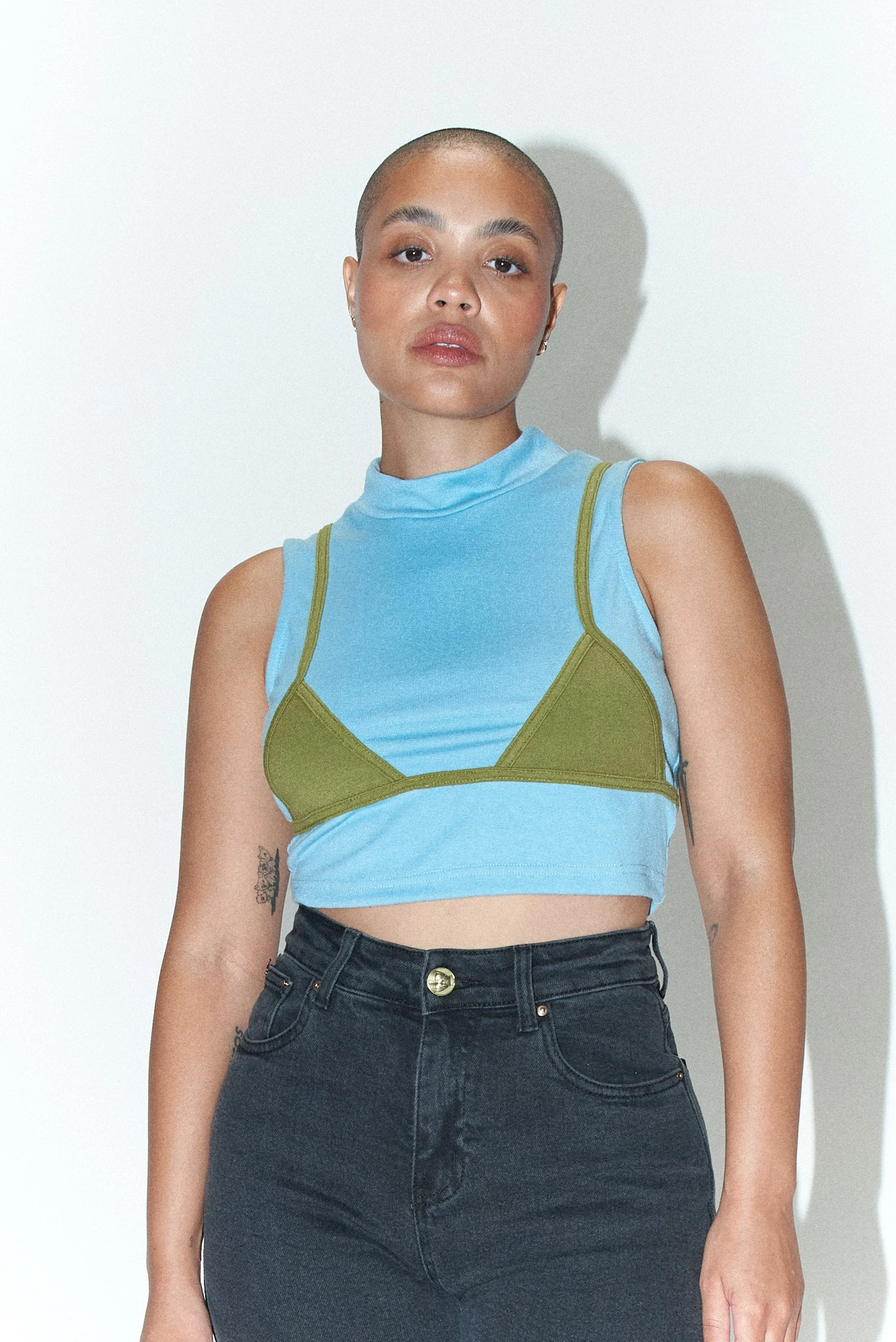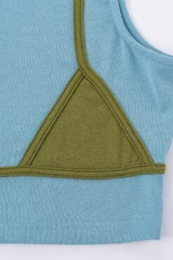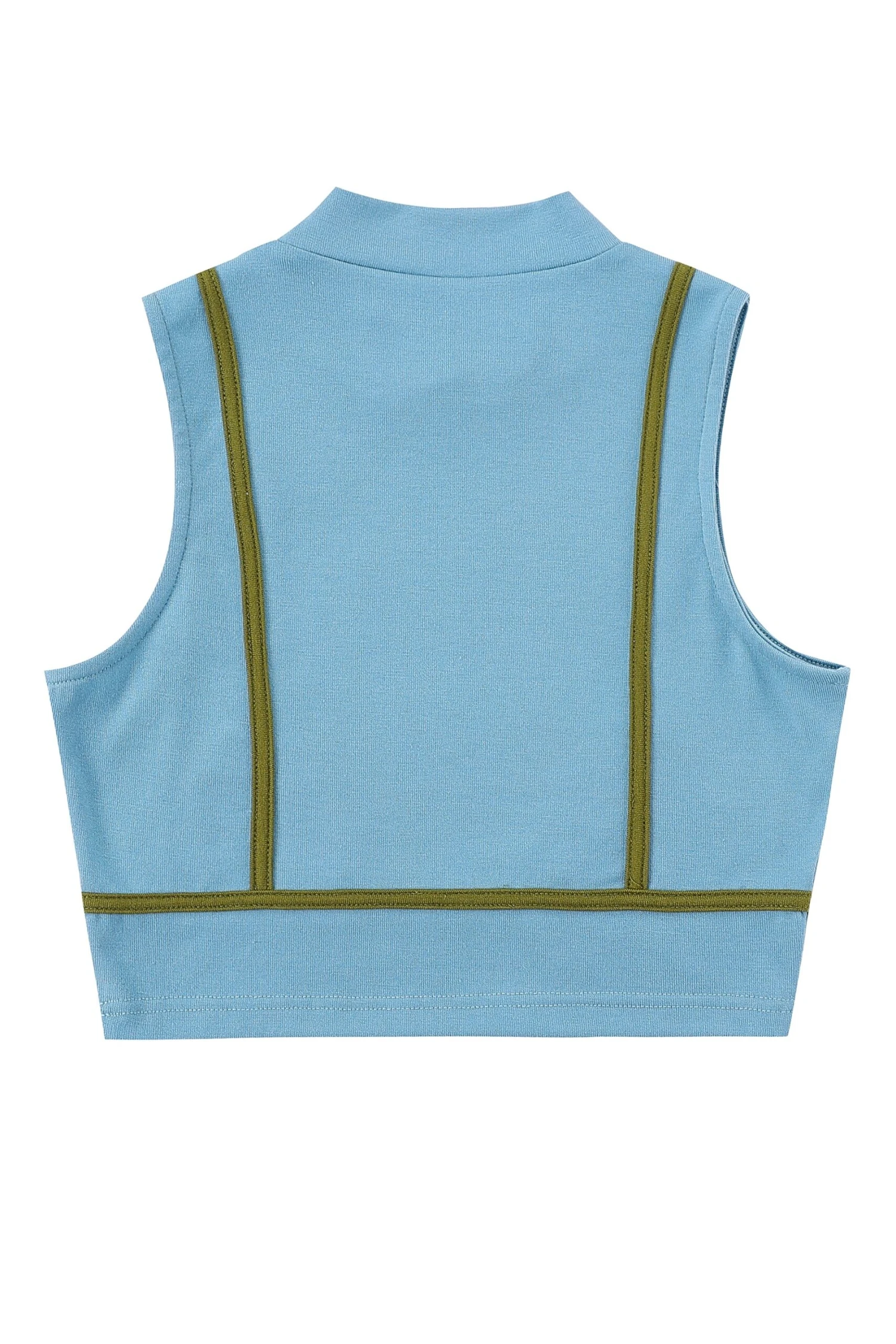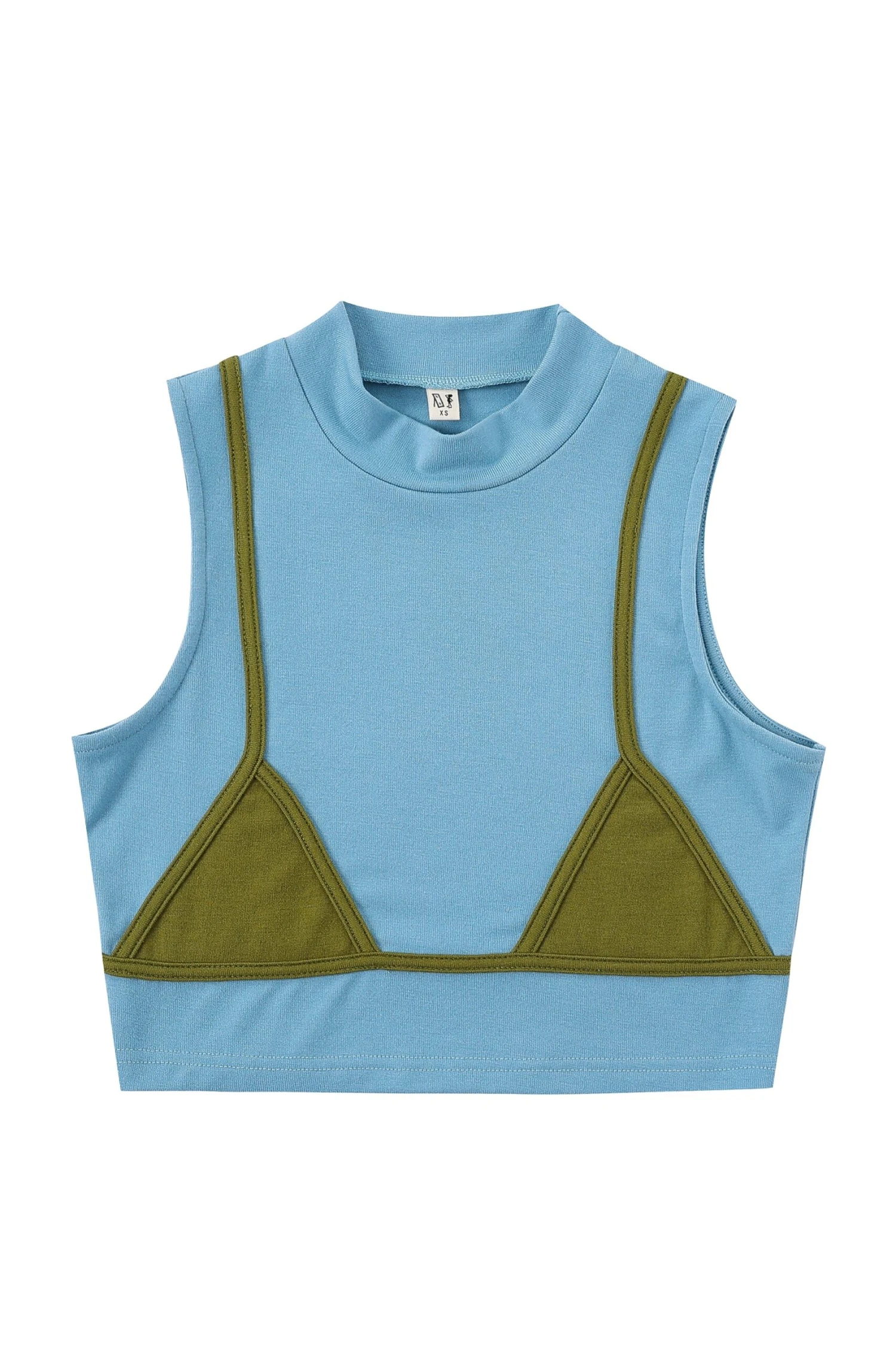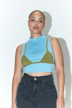 -cotton/spandex stretchy pull on top with bikini seams and flattering mock-neck. A great everyday comfortable crop top.