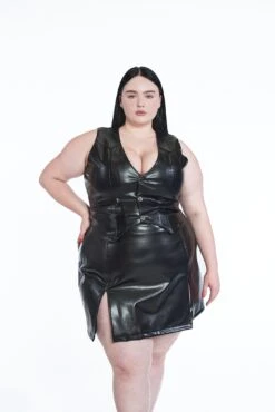 The fit on this skirt is unreal. It hugs the waist nice and snug but don’t worry! It also has a bit of stretch so you can do your post-dinner dance routine full-out. It flares out over the butt and thighs and has two slits down either thigh for maximum mobility. This is made of a new “eco leather”. It feels like real leather and unlike other faux leather fabrics, it’s made from plant waste instead of plastics. It’s also much sturdier than most fake leathers so you wear it forever and then hand it down to your offspring or favorite young person.Â