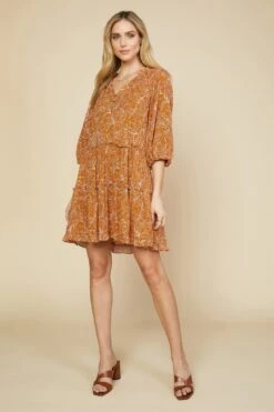 With its sweetly tied neckline, ruffle accents, and gently puffed sleeves, this Botanical print dress is just so pretty. But the way the clay color shines in the light is just stunning. That really takes the obsession up a notch.