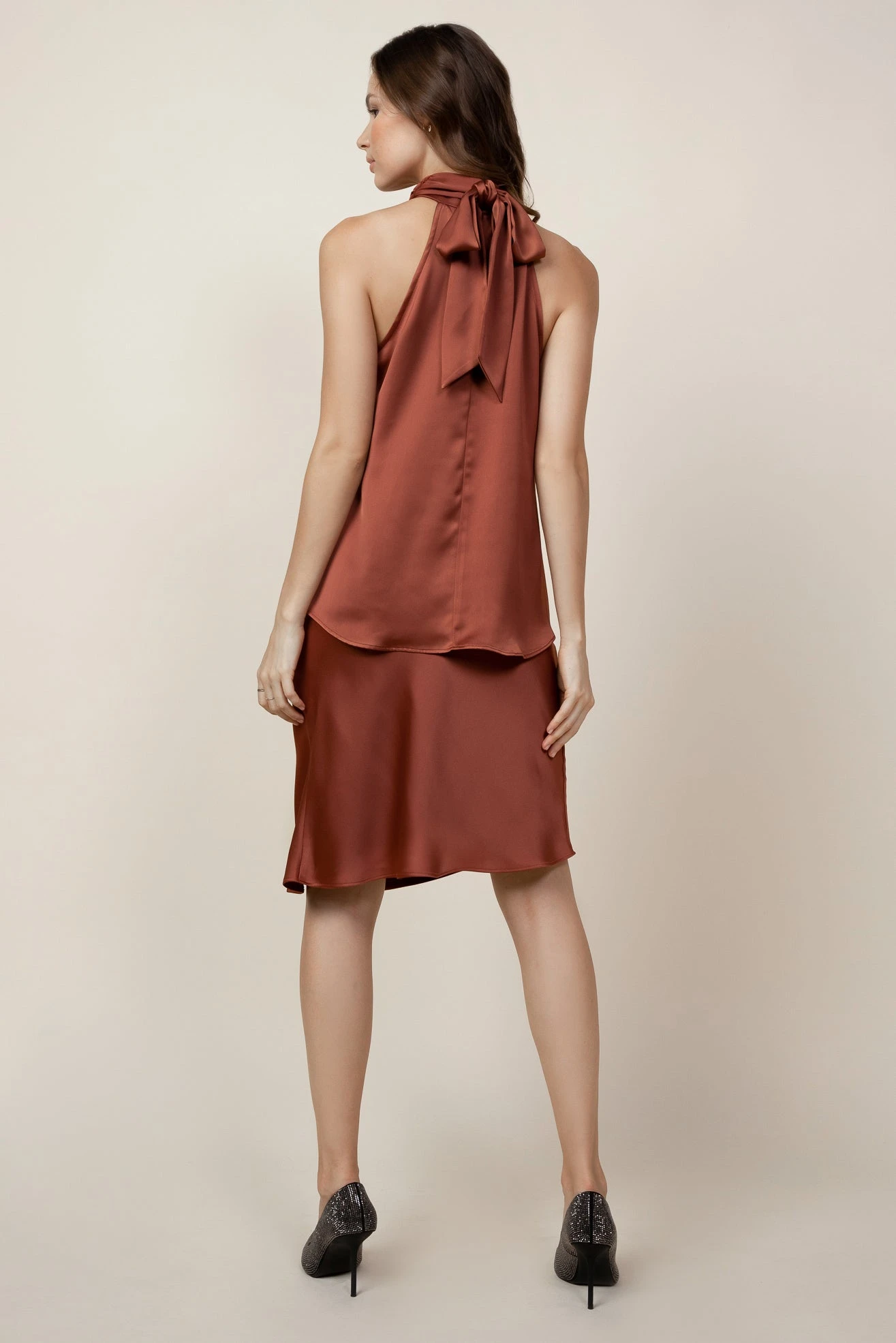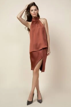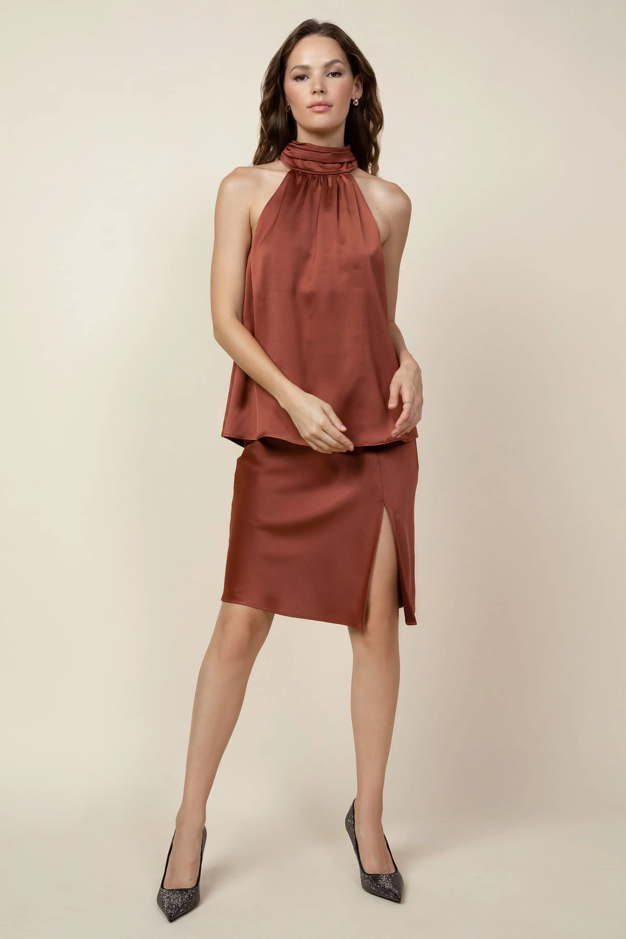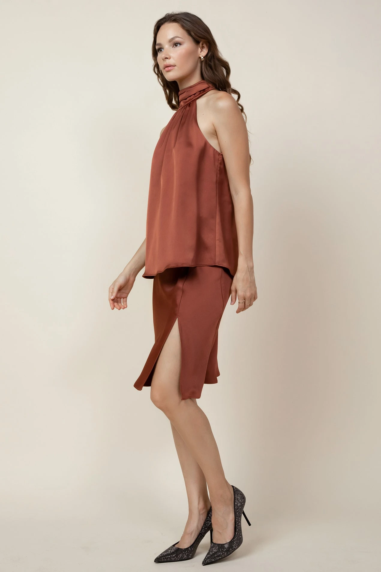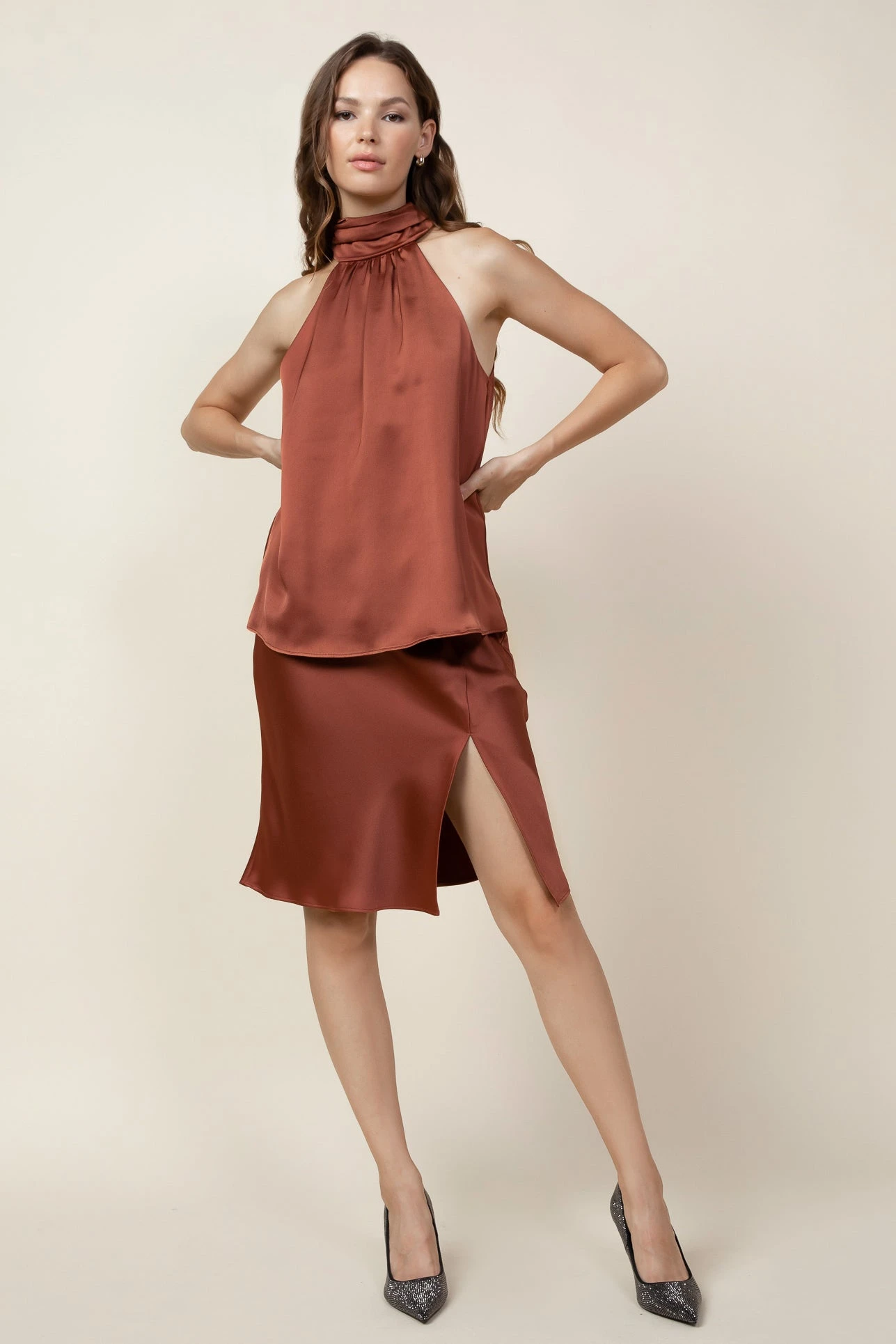 Anchored by a shirred halter neckline that ties into a bow at the back, this sleeveless satin top is exceptionally alluring. It’s cut with the perfect amount of ease, so it skims the body beautifully.