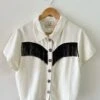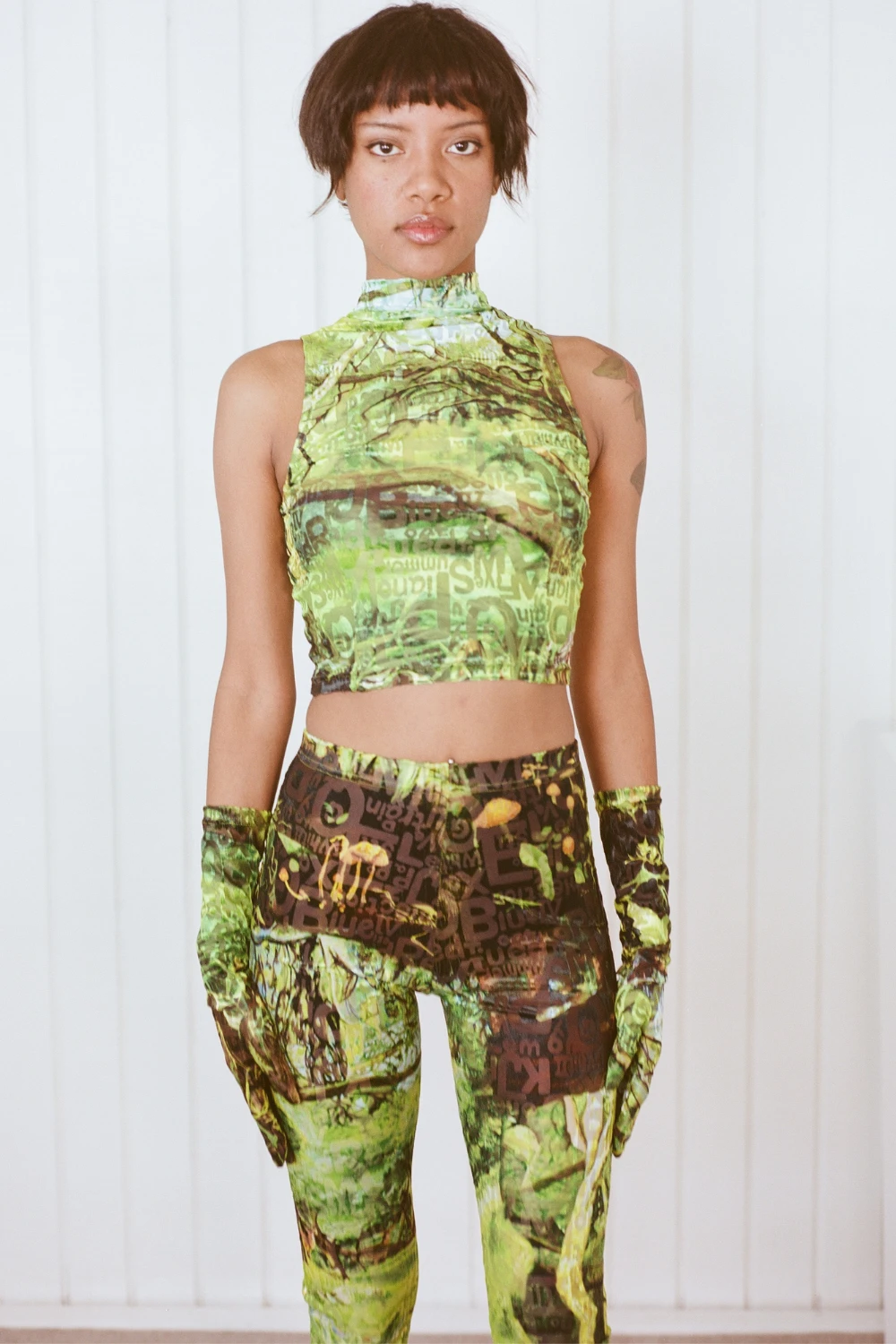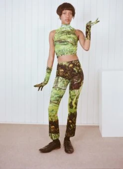 A stretchy, mesh-velvet crop top with soft wordy texture and Cayetana print. An itty bitty mock turtleneck to keep the wind off just the bottom part of your neck. The top of it has to fend for itself. Slightly sheer and perfect for layering.Â