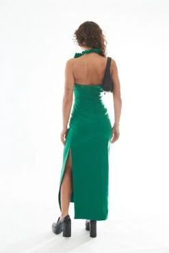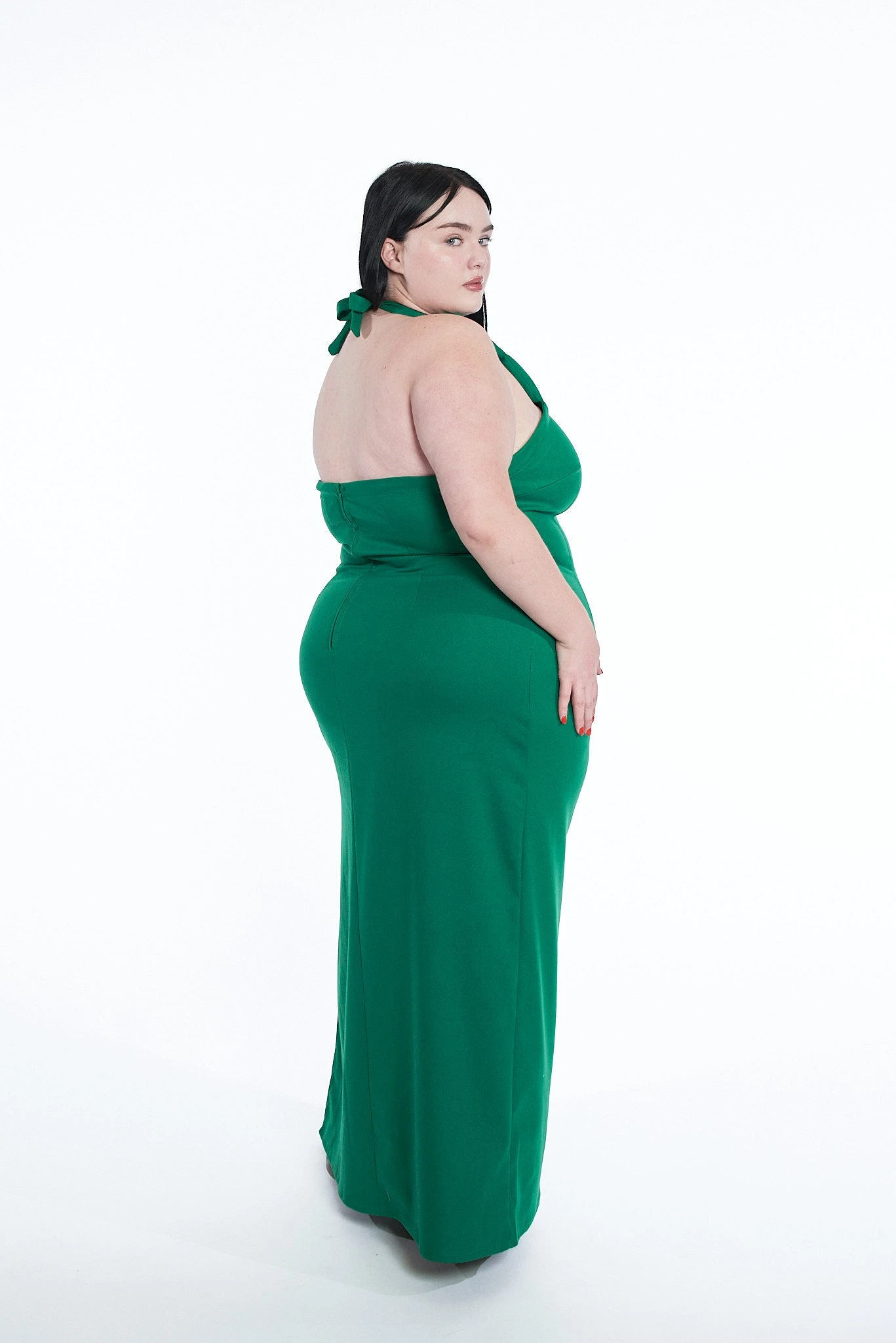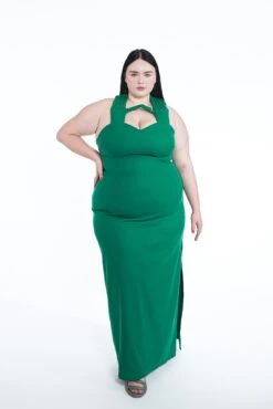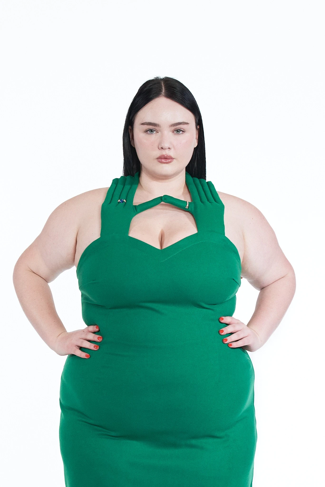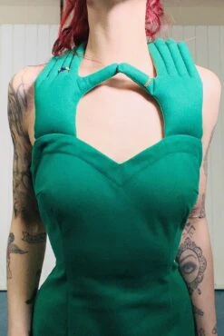 A full-length gown made of a sturdy wrinkle-proof fabric. The stuffed hands gently grip your neck and are adorned with two dainty rings. A slit at the side lets your leggy peek out for air and the halter tie lets you adjust how tight you want the hands around your neck.Â