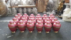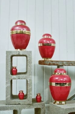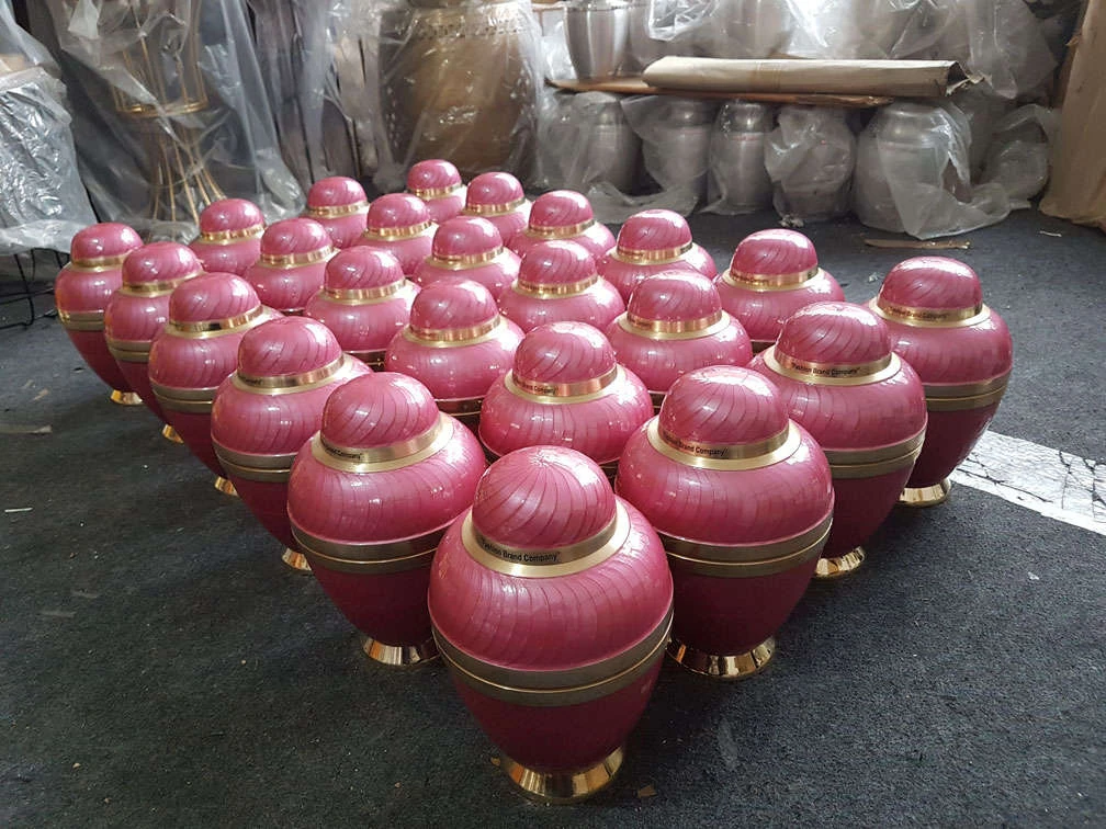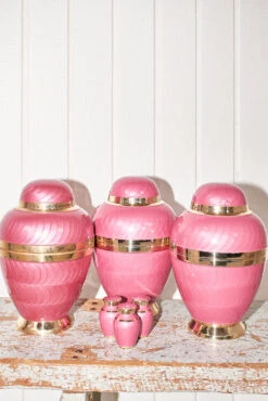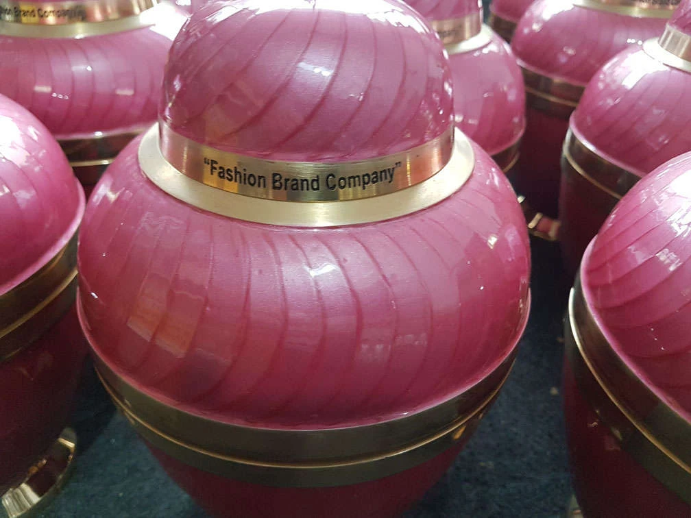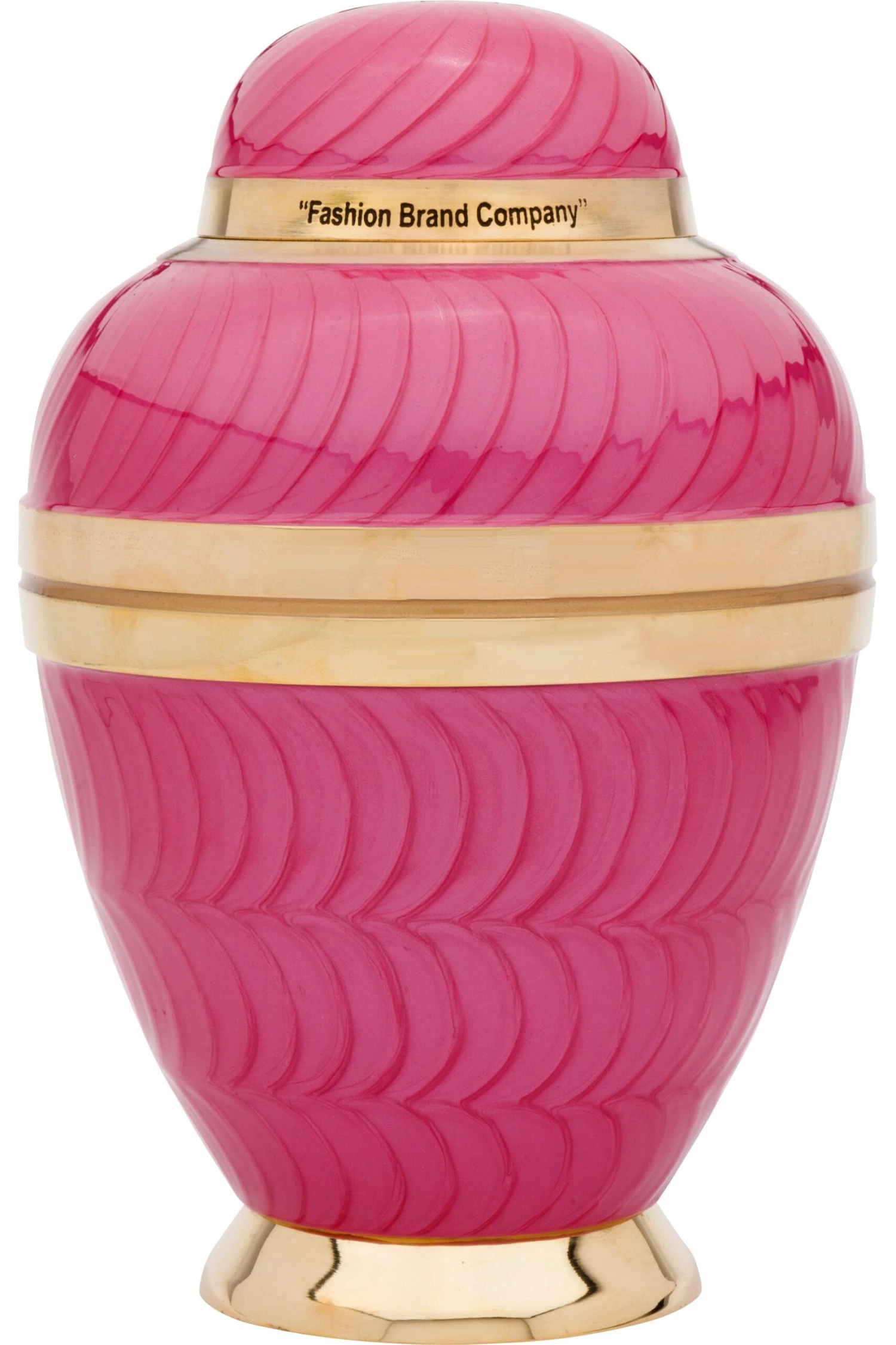 Custom made and designed Metal urn with pink enamel and glossy finish. The top twists off and reads “fashion brand company”. Ashes to ashes. Dust to dust.Â