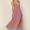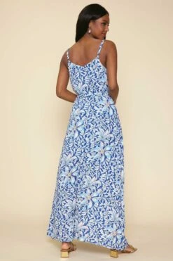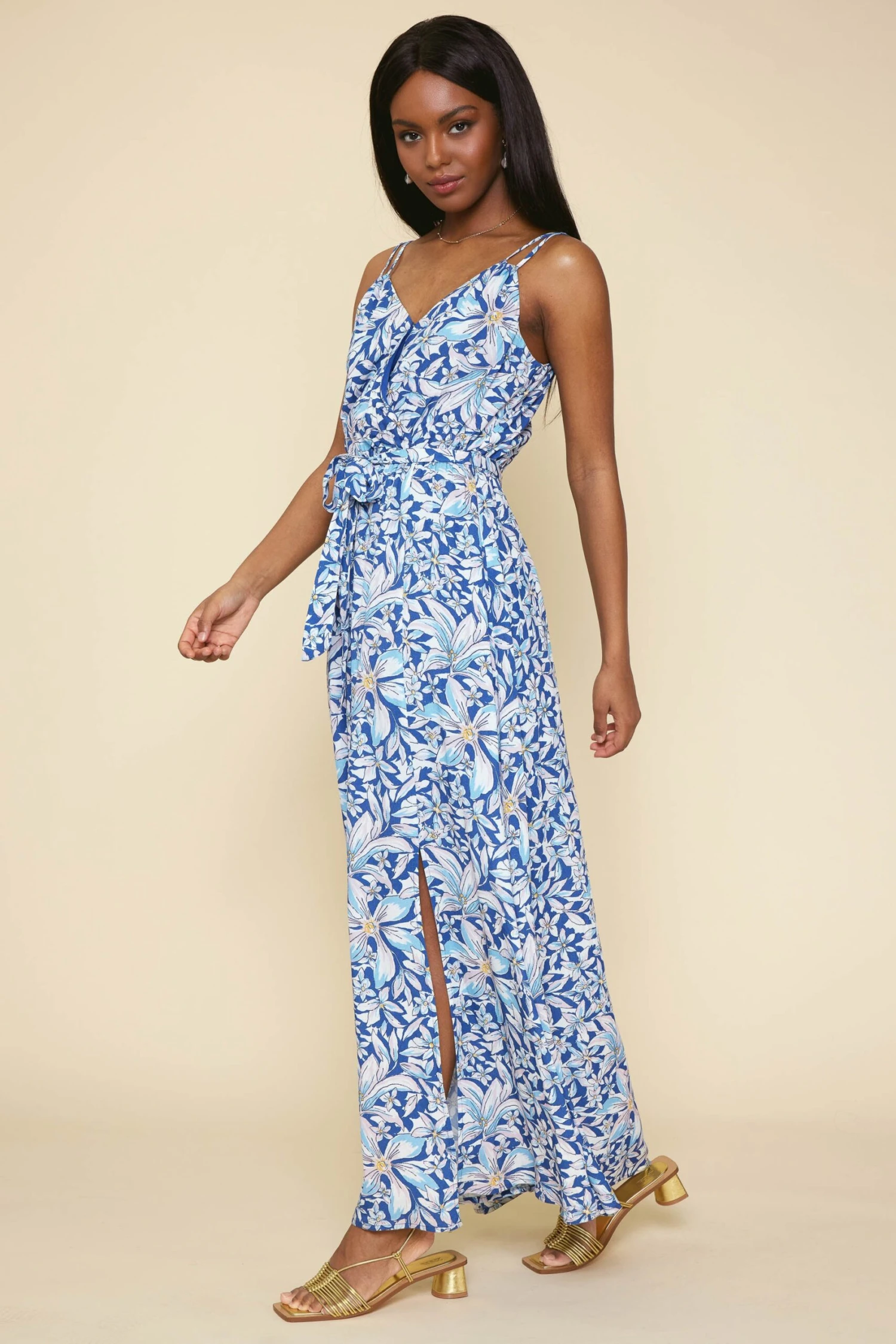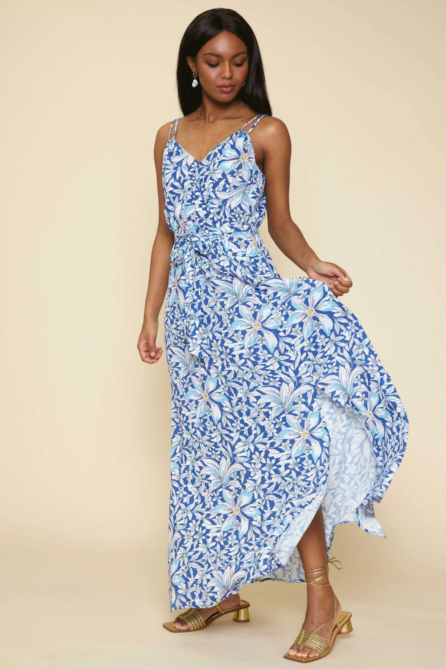 A fresh-picked floral print decorates this summer-ready maxi dress. The breezy number has looped straps, a surplice-style bodice, and a long, loose skirt with a leg-baring front slit. Define the waist with the matching tie belt.