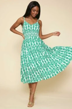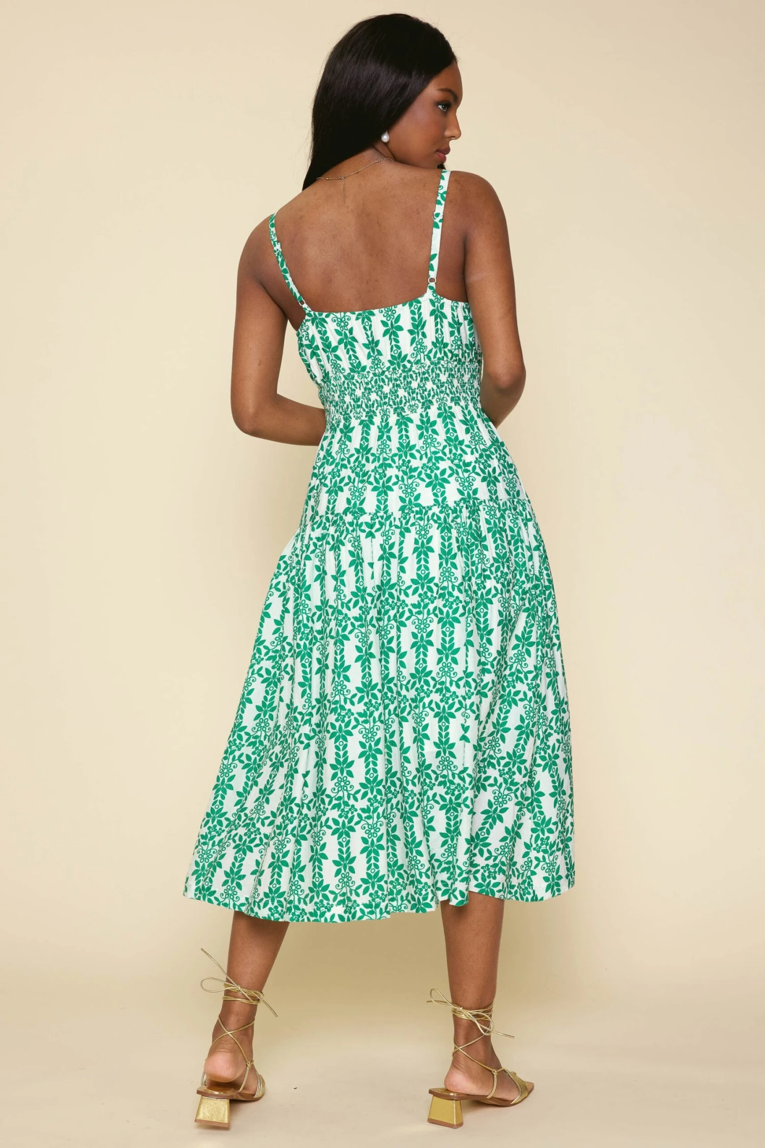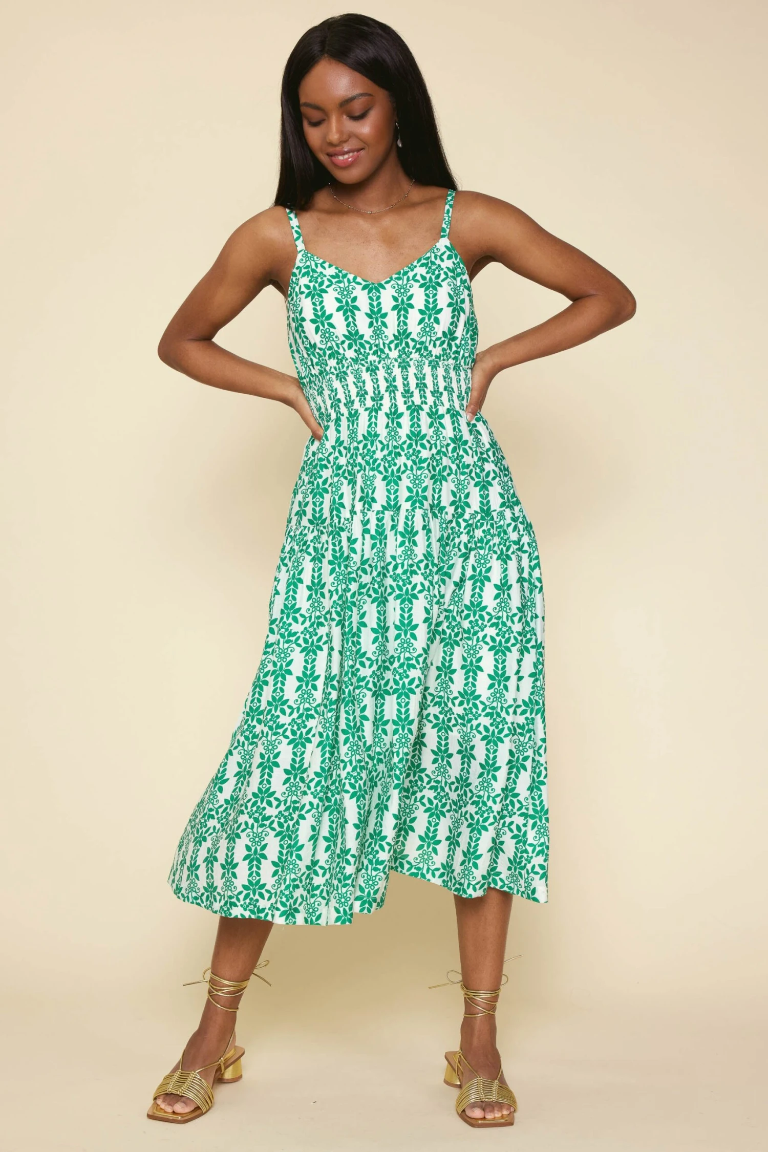 Perfection in floral print. This summery midi dress hugs your shape with a smocked waist before falling to a swishy shin-skimming hem. Easy to pair with strappy sandals or fresh sneakers.