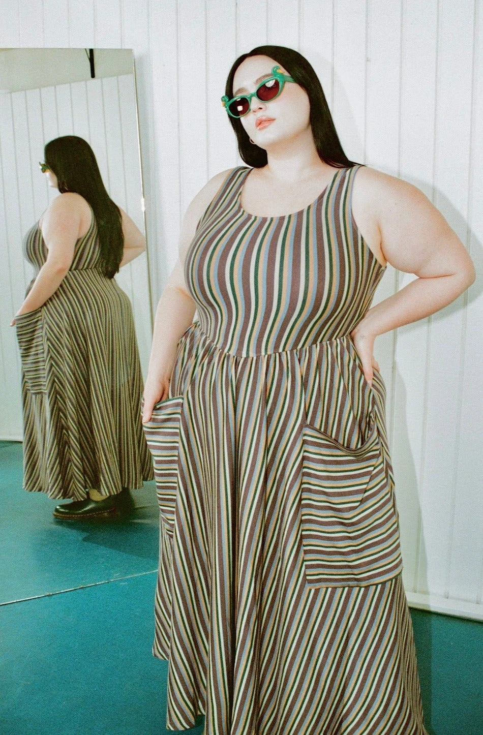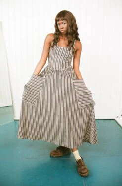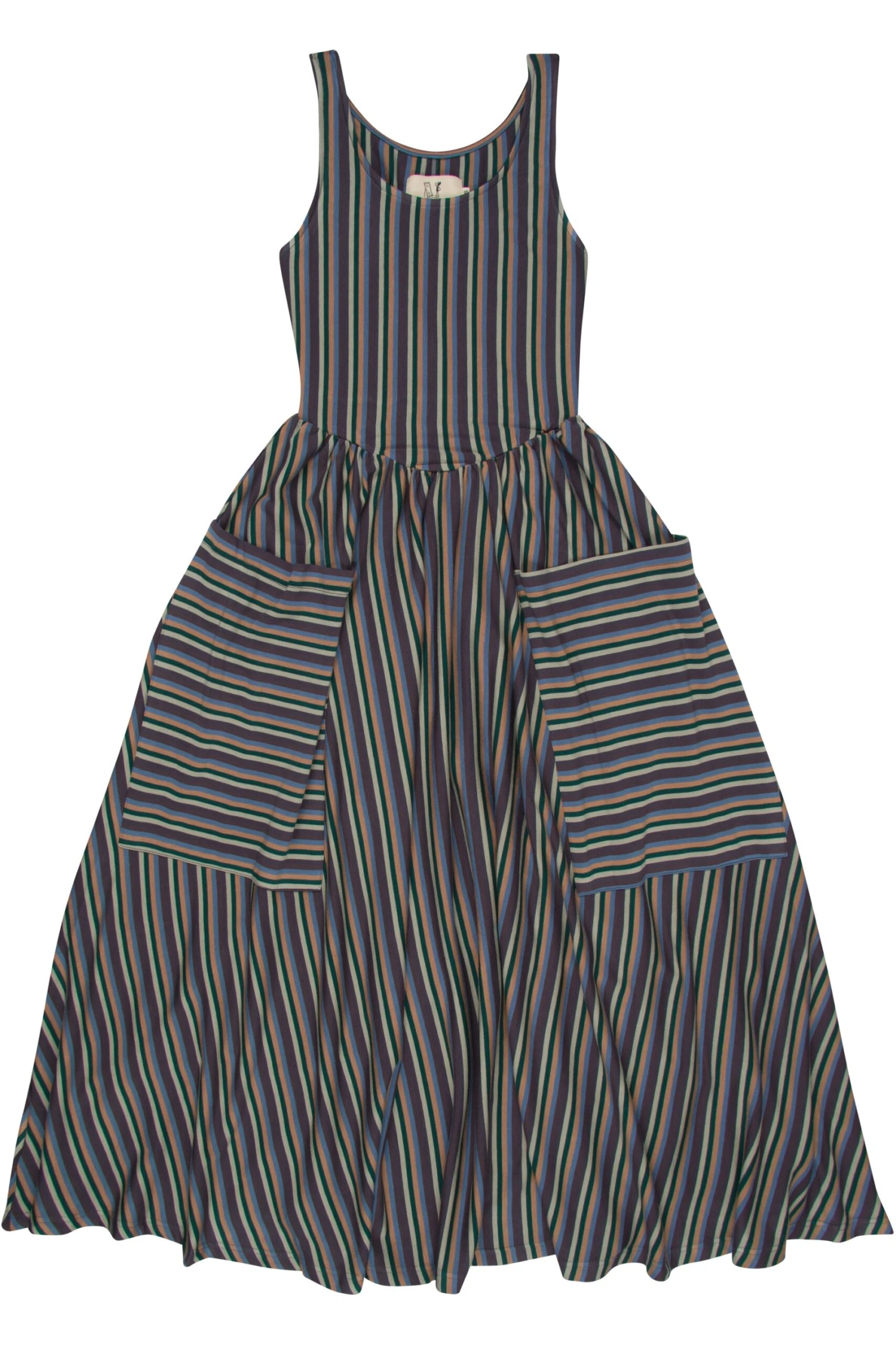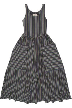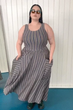 Long dress with long stripes. Very stretchy. Cinched waist. Stupidly huge pockets. Has the capacity to carry 28 liters of dried beans. DO NOT TRY TO CARRY MORE THAN THIS RECOMMENDED AMOUNT.