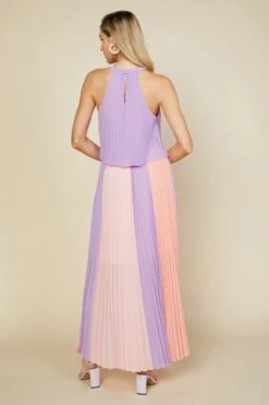 This halter maxi dress floats in the air with all those breezy pleats. It’s got a fluttery lavender-hued overlay at the bodice before falling to a cascading skirt color blocked in wide stripes of coral, lavender, and ballet pink. Finished with raw hems and a keyhole at the back, the style is absolutely stunning in motion.