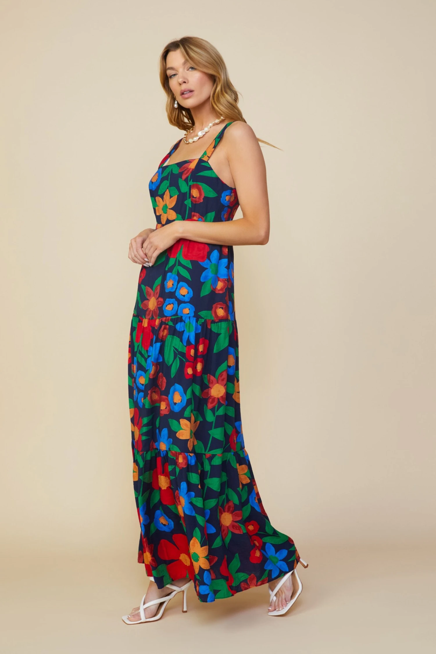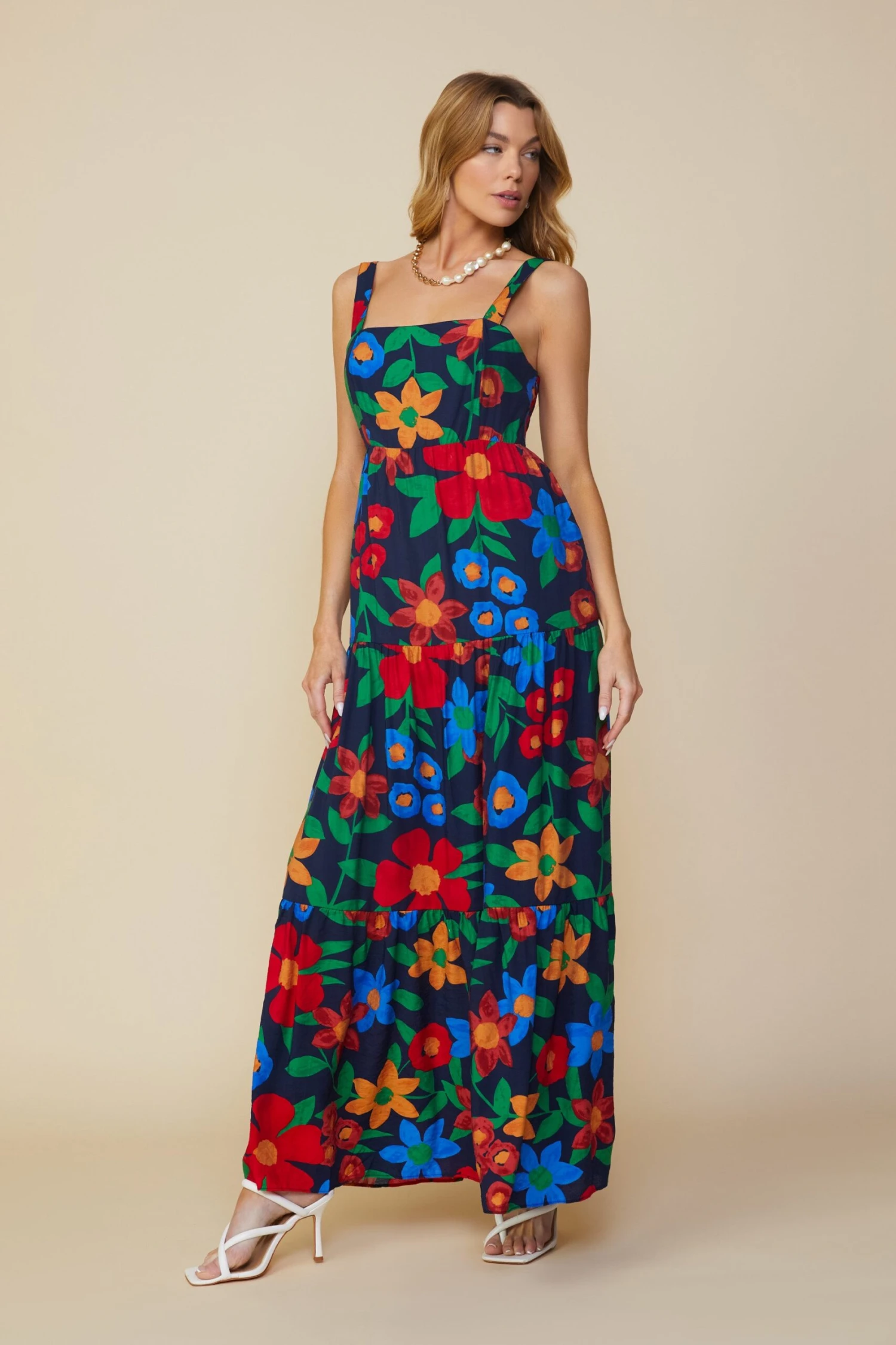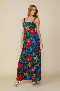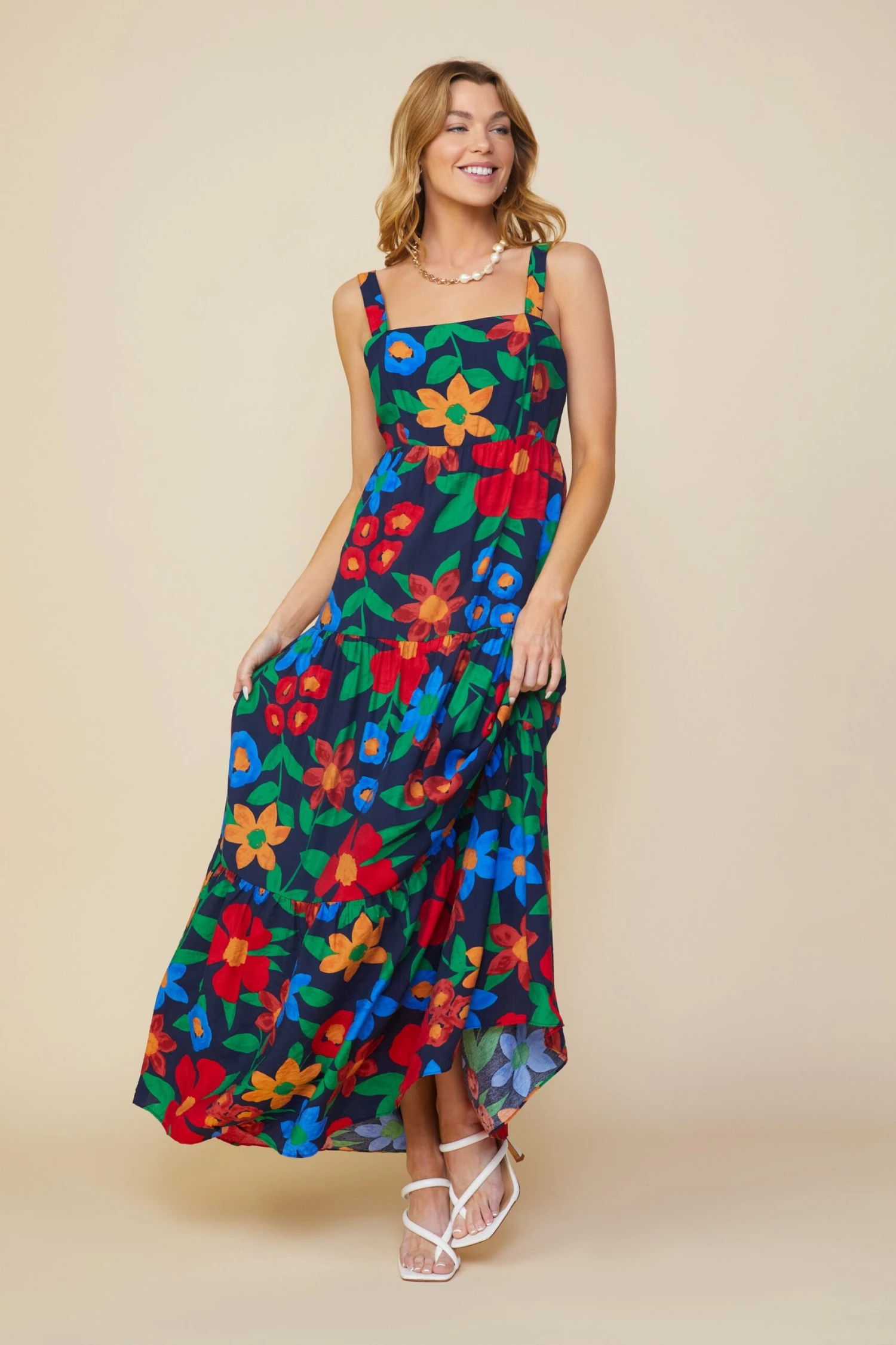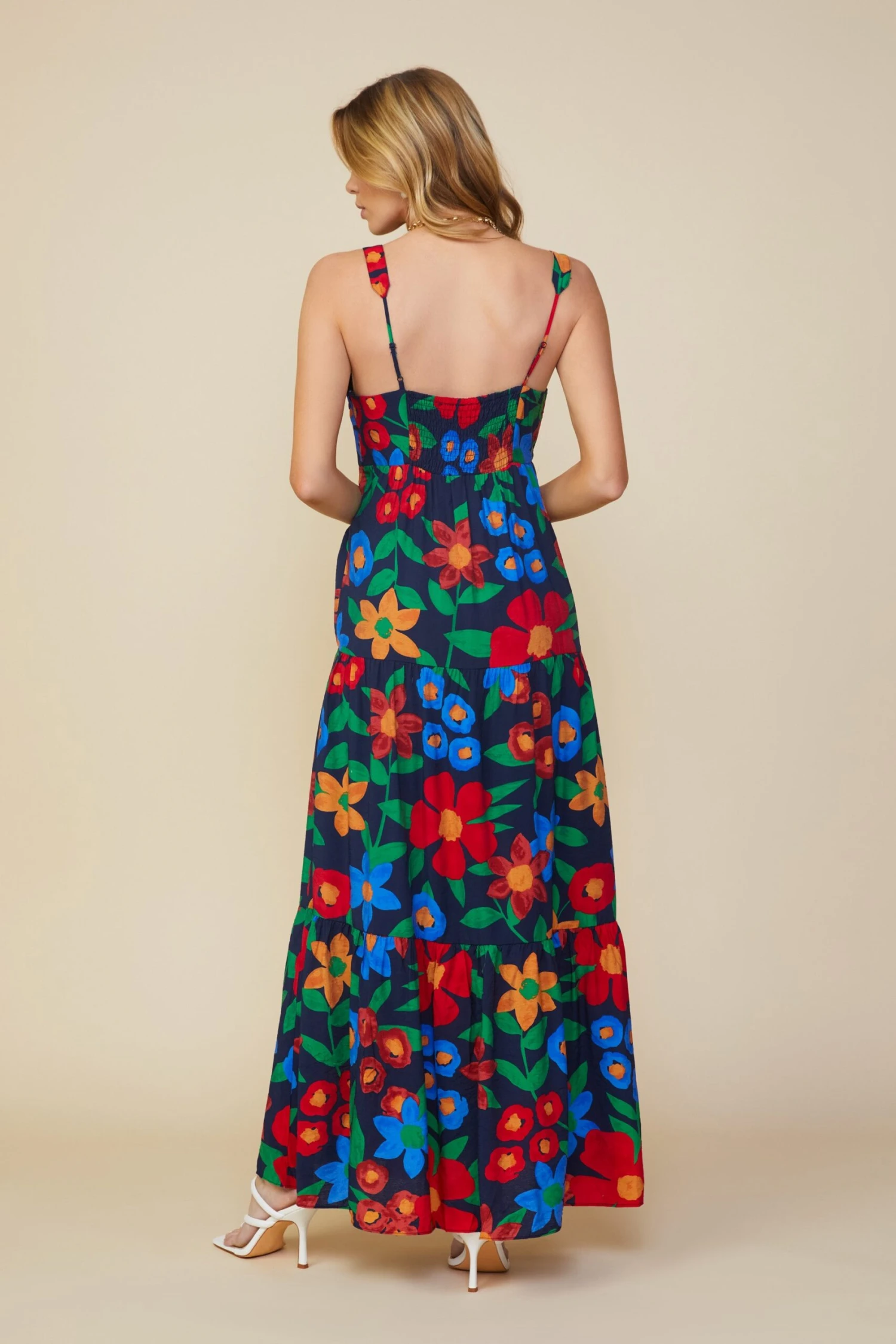 A vibrant floral print makes this tiered maxi dress a must-have for sunny days. Adjustable shoulder straps and smocking at the back create the perfect fit at the bodice, leading to a flowy hem.
