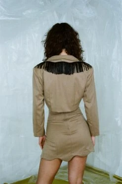 A high-waisted beige skirt with a wavy hem and waistline mimicking natural curves and folds. Made using a thick but breathable fabric with a slight amount of stretch that doesn’t warp or wrinkle after washing. Two slits down either thigh make it more comfortable to move and sit in than a regular pencil skirt. Be gentle.Â