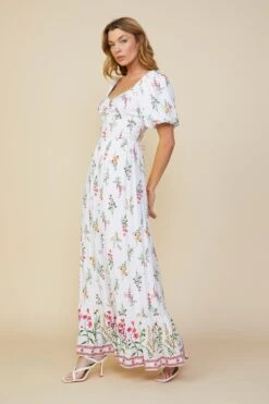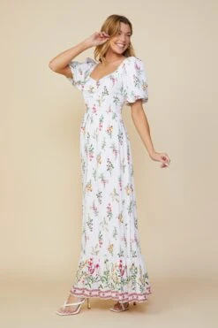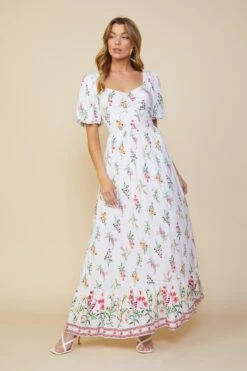 Printed with a vintage-y floral motif, this maxi dress has a fitted bodice with a gathered sweetheart neckline and short bubble sleeves. The flowing skirt has lace trim and a delicate border print that encircles the floor-skimming hem.