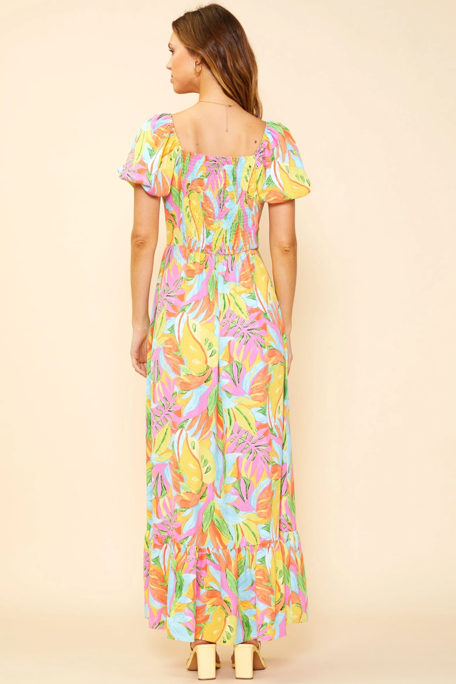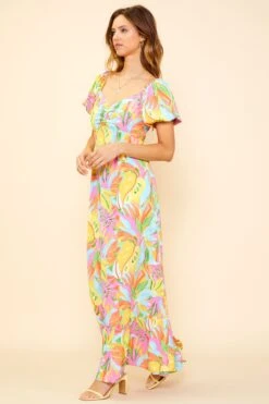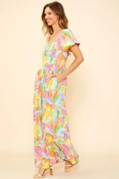 With its painterly tropical print, this maxi dress is bright and beachy. A sweetheart neckline and puffed short sleeves defined the shape up top. Smocking at the back ensures a comfortable feel.