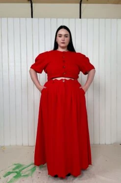 An homage to America’s sweetheart. Thick sturdy Linen with an adorable (and painstakingly difficult to execute neatly) zig-zag cut on the waist and bottom hem. “Mother of Pearl” button and a subtle bit of elastic scrunch at the back of the waist allow this skirt to adjust to you. It also has belt loops. Don’t forget about those.Â