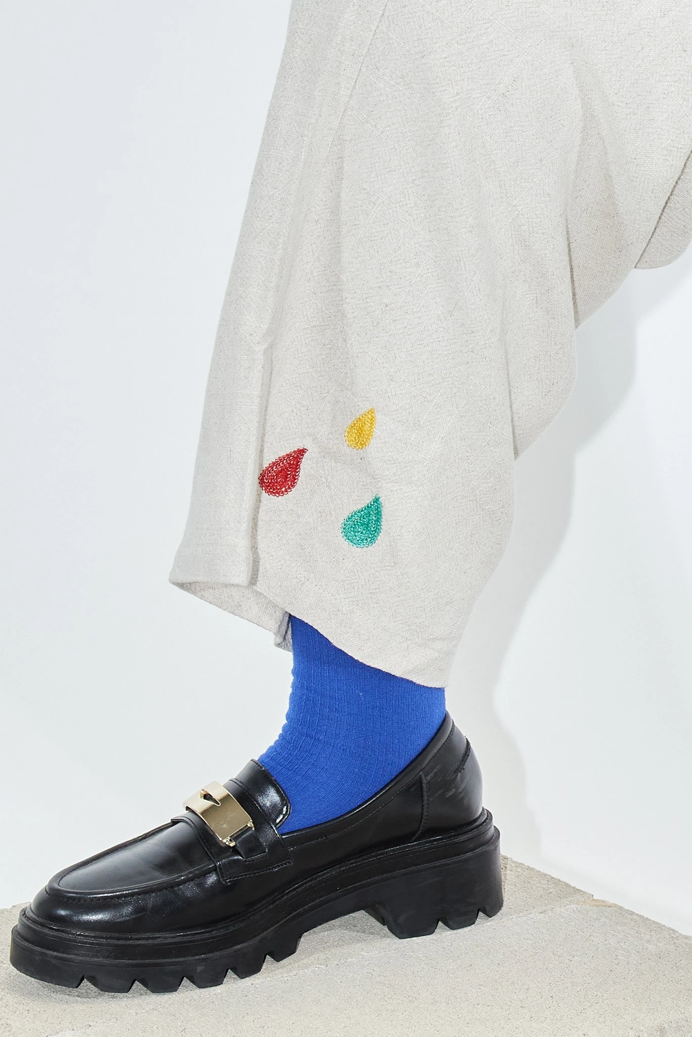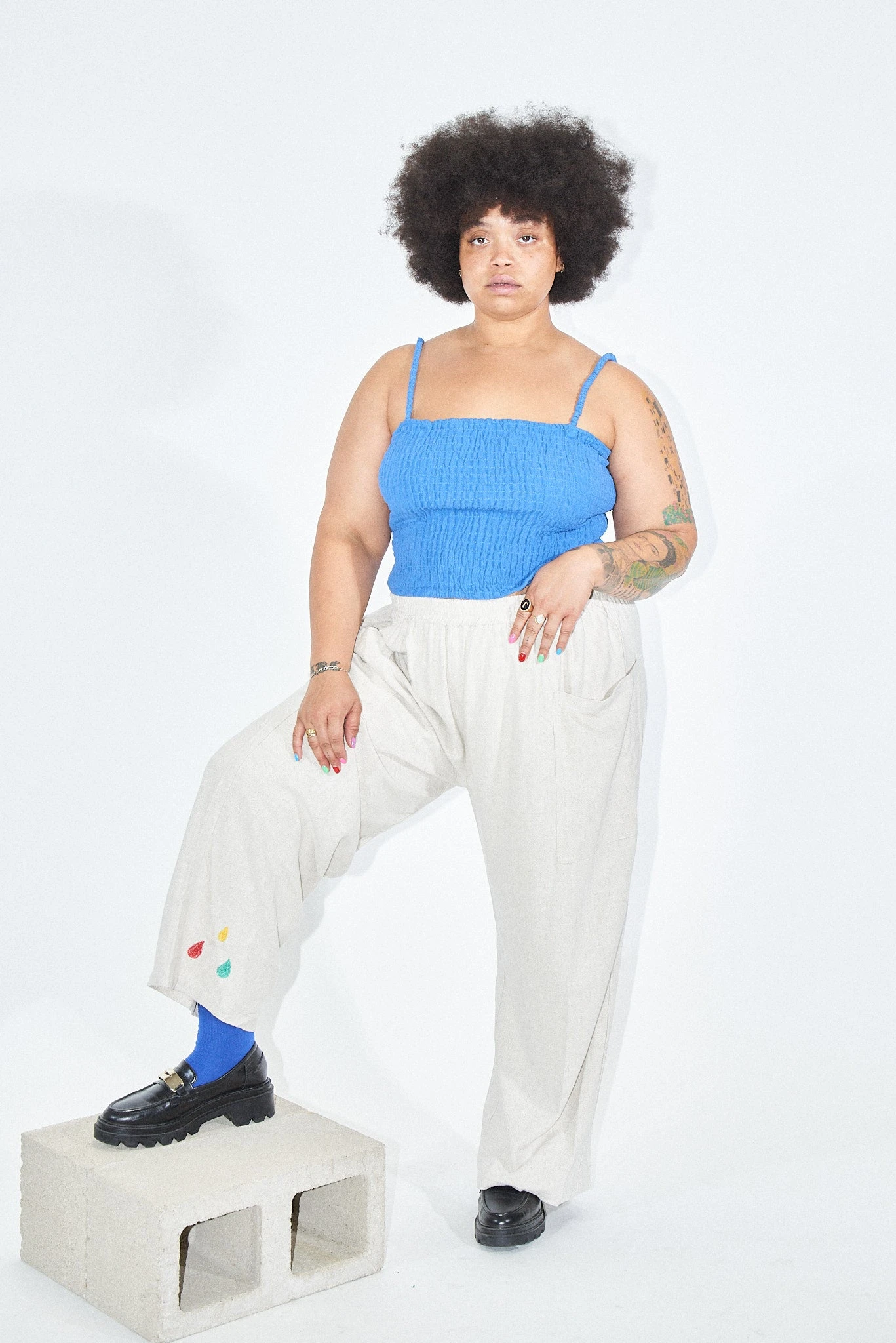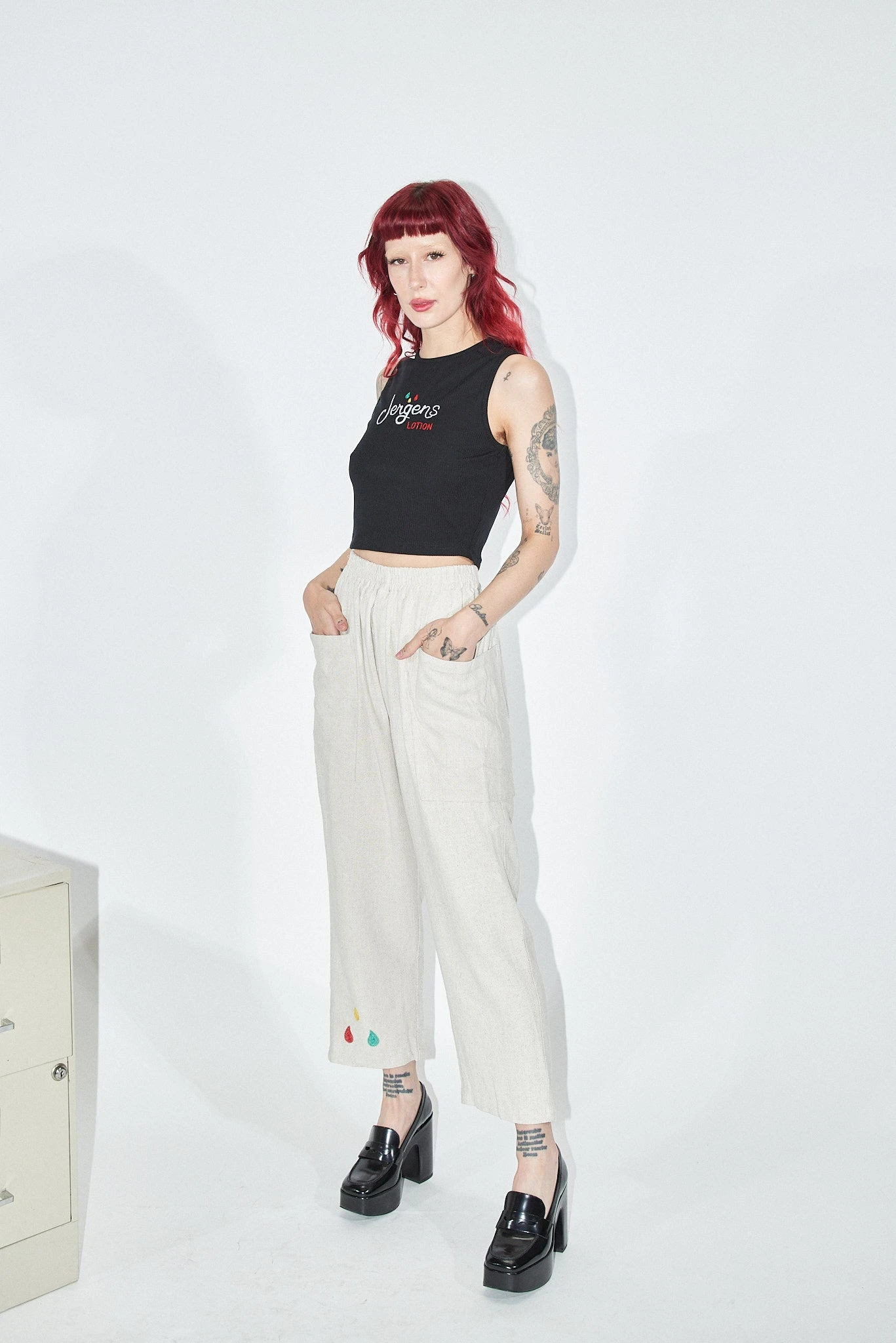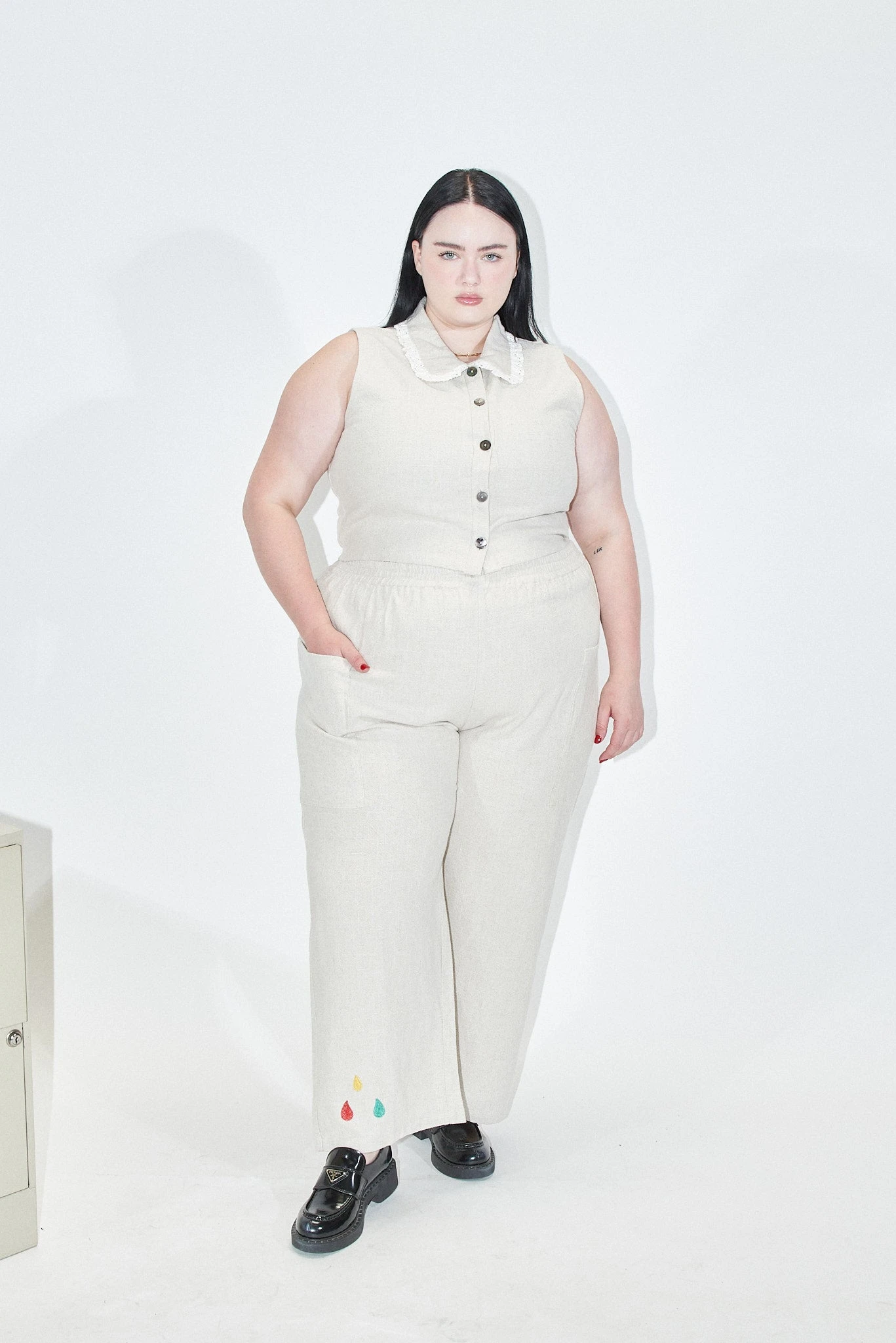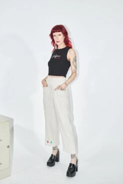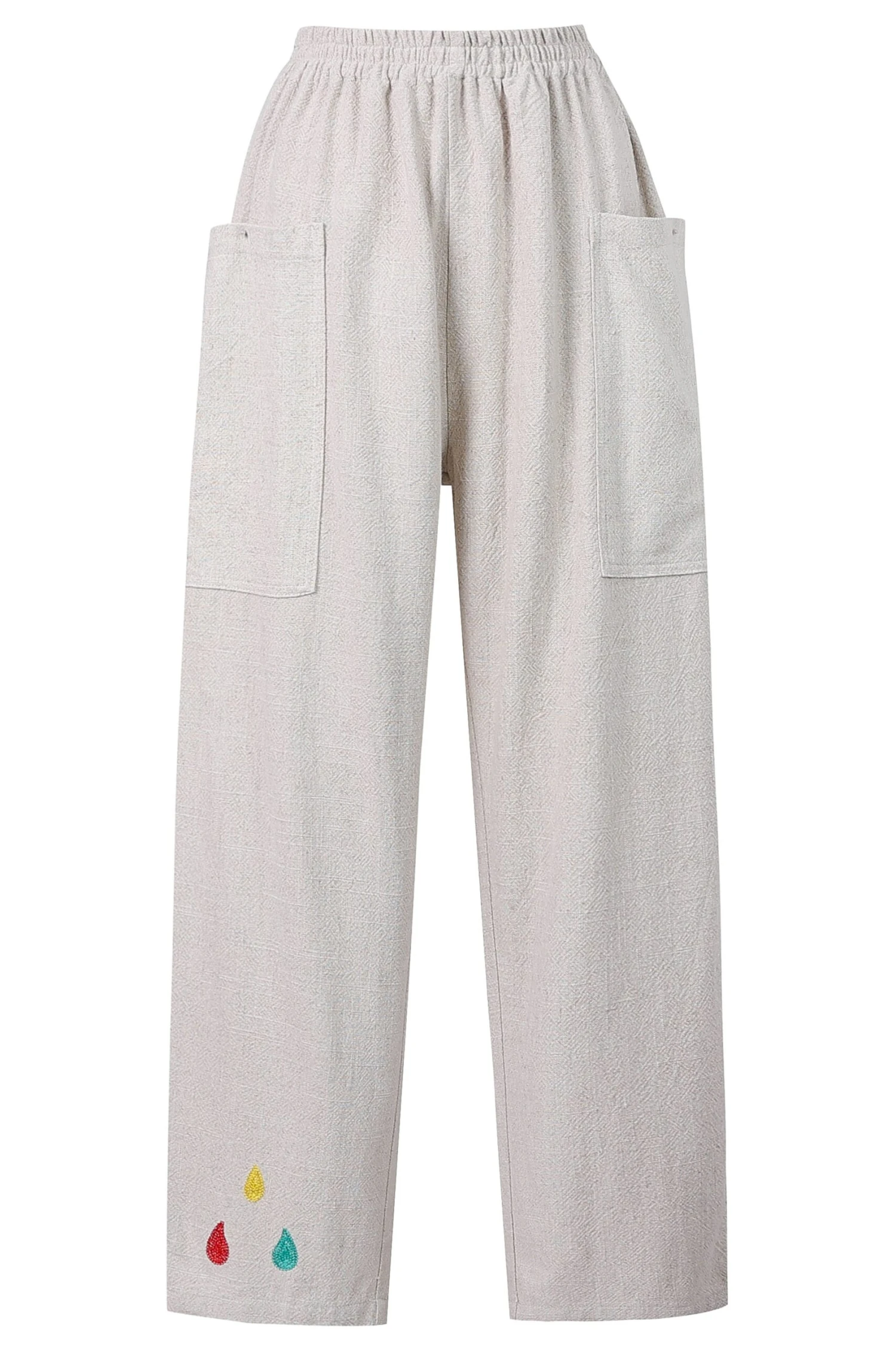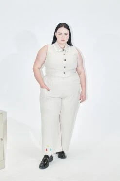 100% linen cream colored pants with big ol’ thigh pockets for all your bear necessities. These are the comfy pants you change into after a long day. Maybe you’ll go out again, but you’re keeping these pants on. No zipper or button. Just the way mama likes it.Â