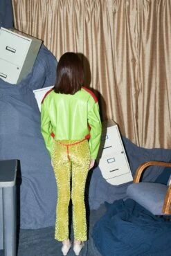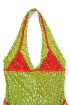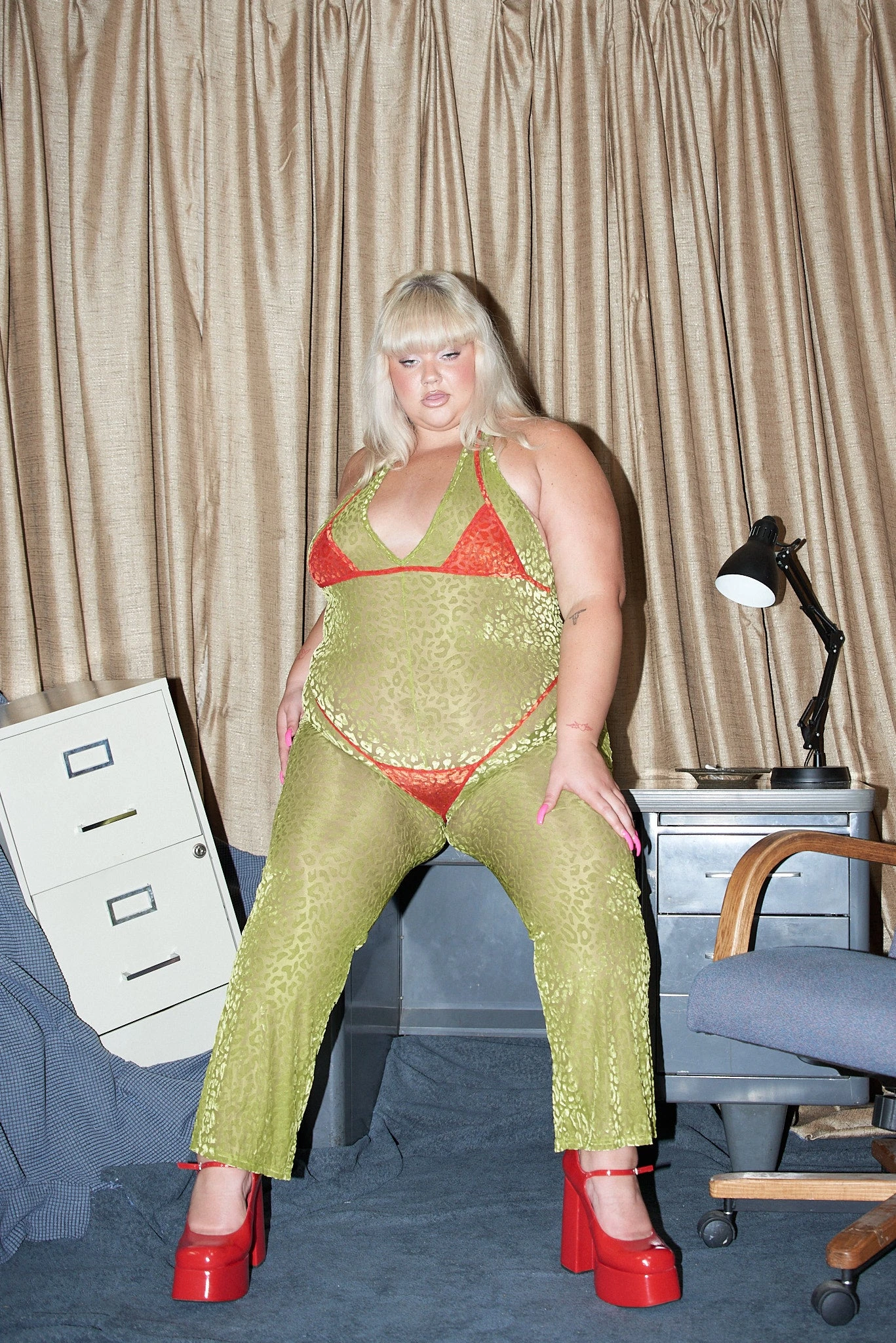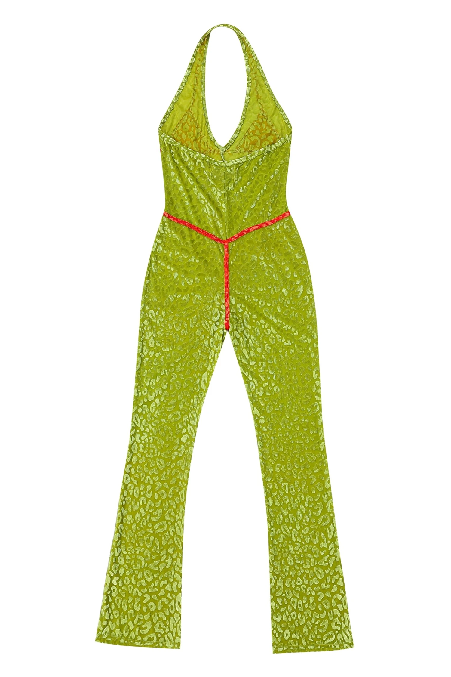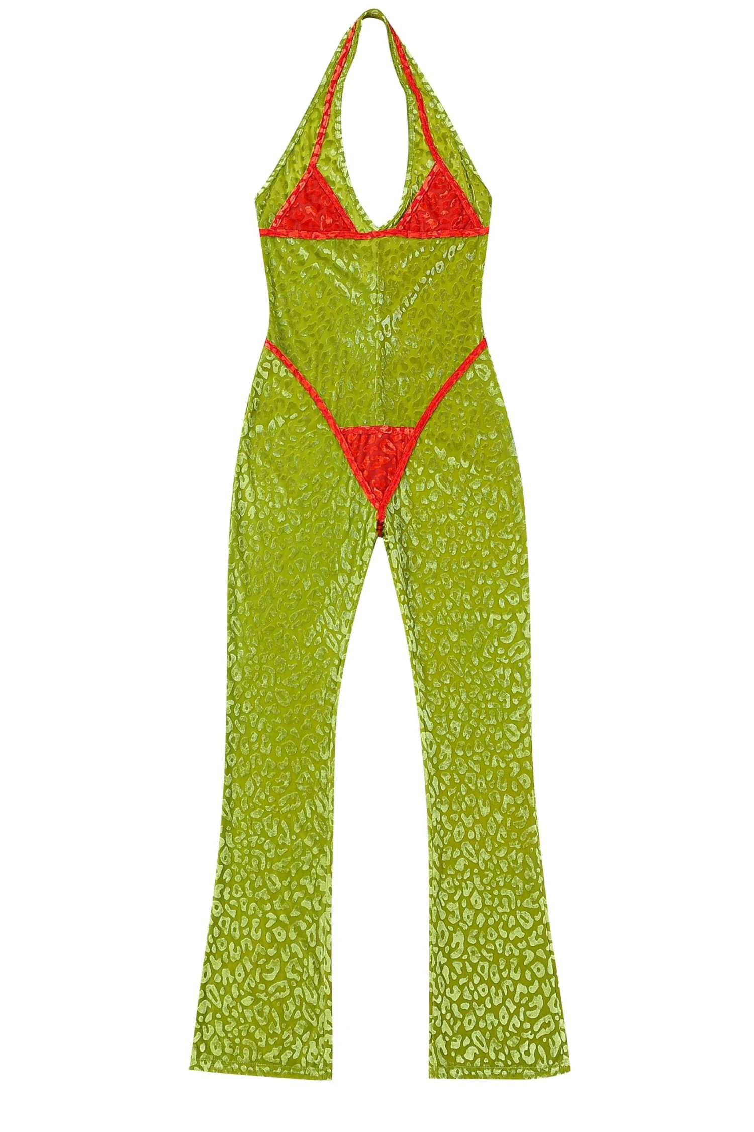 A stretchy mesh-velvet jumpsuit with a slightly flared leg and deep-V neckline. Very little boob support. Very classy.Â