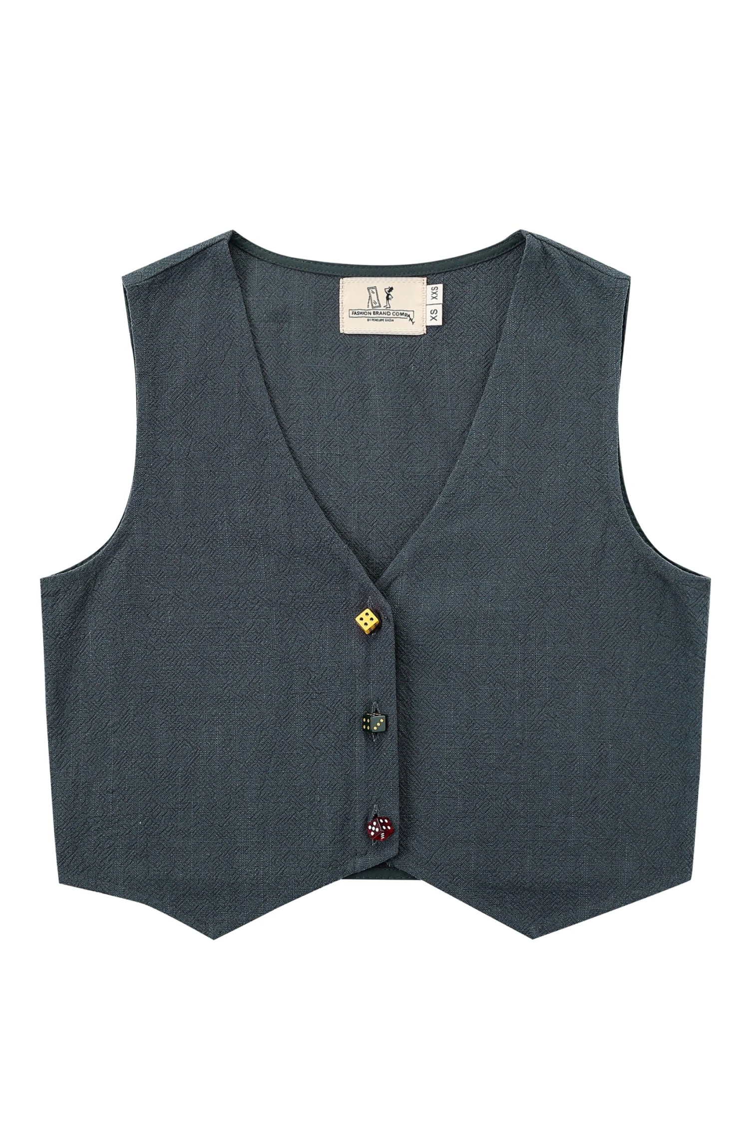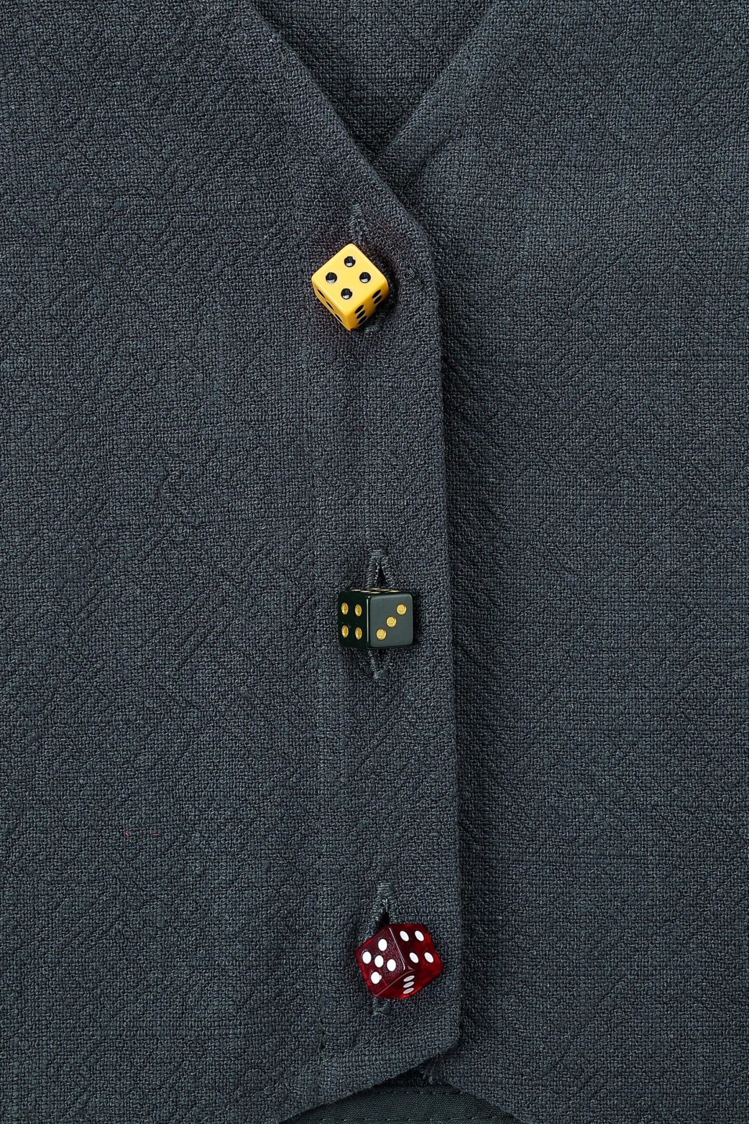 There’s nothing like a cute little vest to make you feel like a silly little guy who’s got some serious business to handle. Custom made acetate dice buttons that have “FBC’ engraved on one side.Â