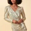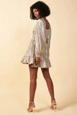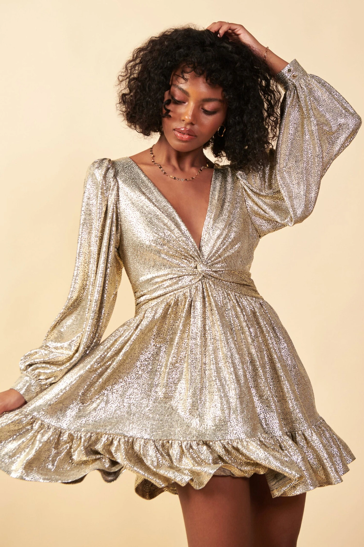 Make the night shine in this party-perfect mini dress. Gleaming bright in a metallic foil finish, it’s got a plunging neckline that leads to a cool twist detail and a ruffled hem. But the statement doesn’t stop there—turn around to reveal the daring open back.