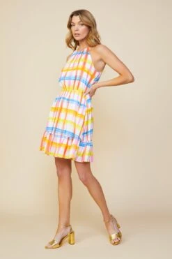 This mini dress combines an artful plaid pattern with a color palette of fun, playful brights. It has a halter neckline and a relaxed, easy fit at the bodice, plus an smocked waist for extra comfort. The voluminous skirt falls to a ruffled hem that dances at mid-thigh length.