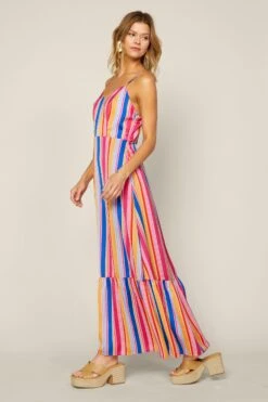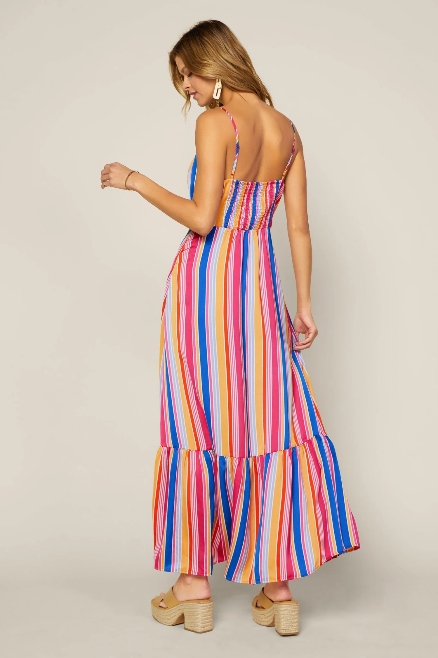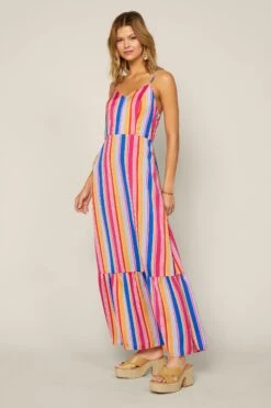 It’s time to have fun with your style again. This striped midi dress makes it happen, done in a palette of playful brights. Adjustable spaghetti straps and smocking at the back bodice make for the perfect comfortable fit.Â