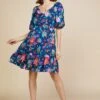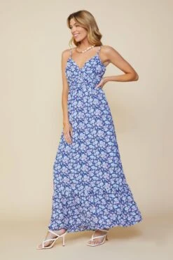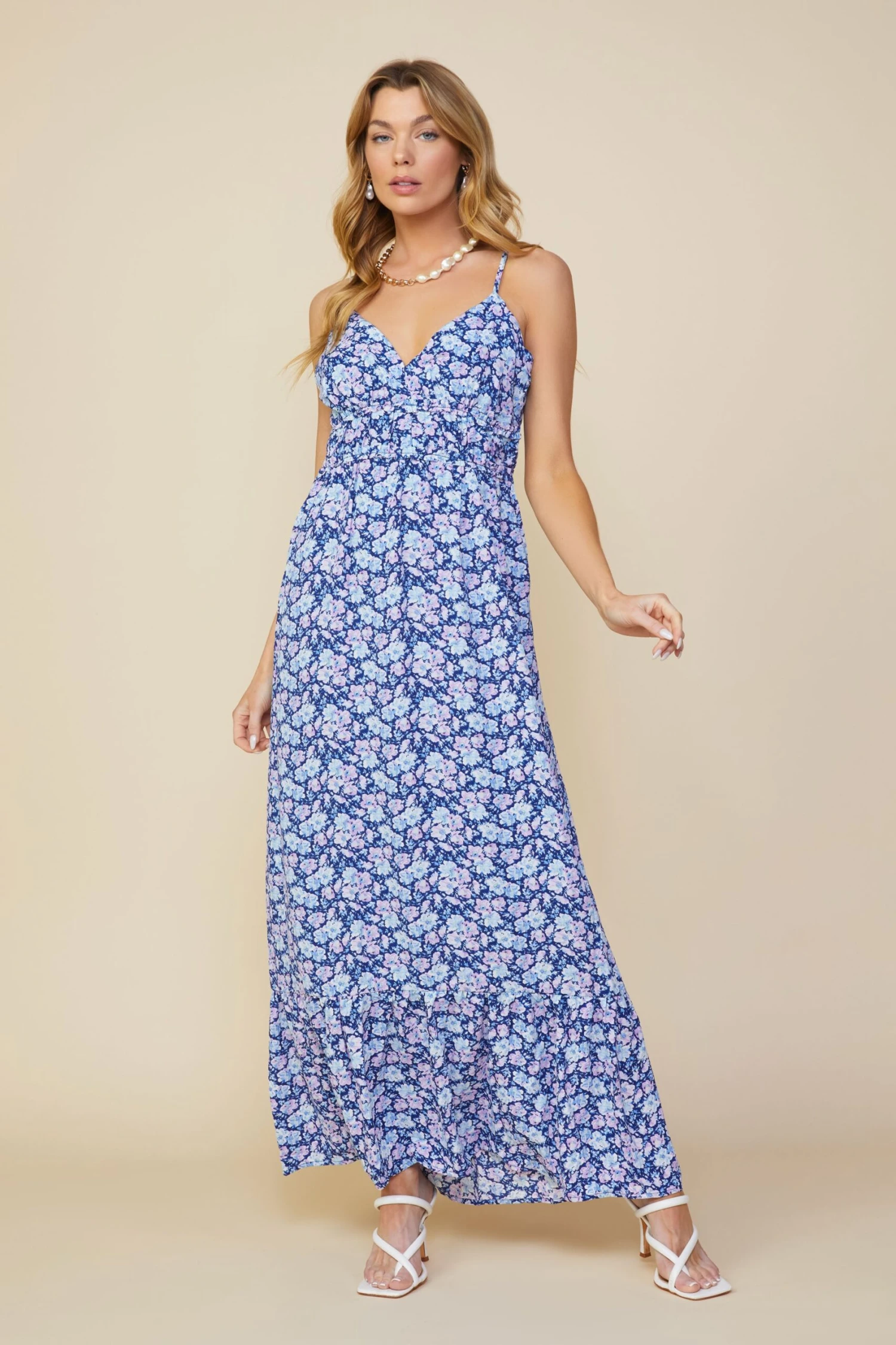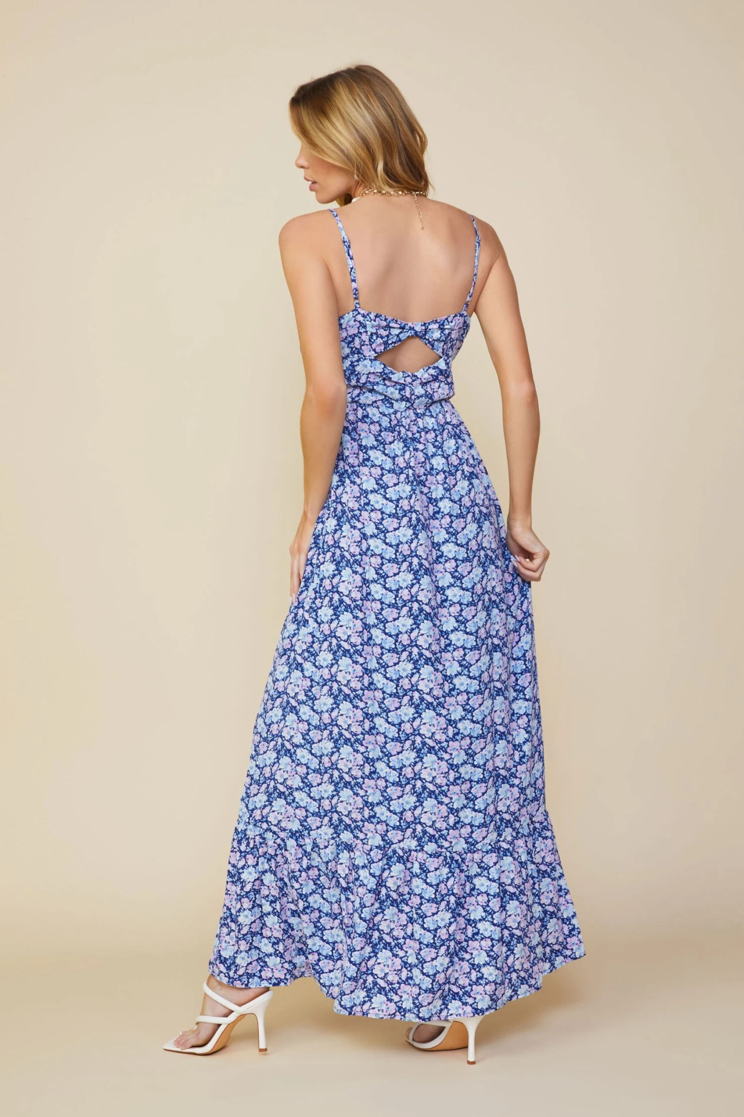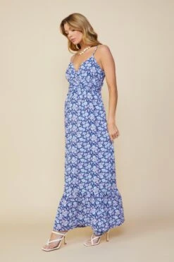 Vacation in dress form. This floral-print maxi dress comes in a floor-sweeping silhouette featuring adjustable straps, ruffle trim, and a cutout back with twist detailing. Just add a pair of sandals and you’re ready to go.Â
