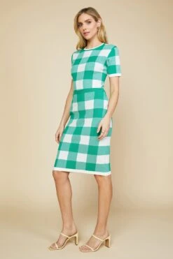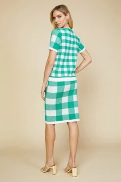 This short-sleeve knit top plays with the scale of its checkerboard motif—it’s bigger and bolder at the front. Ribbed edges create extra definition at the neckline, cuffs, and hem. Go for the set by adding the matching skirt.