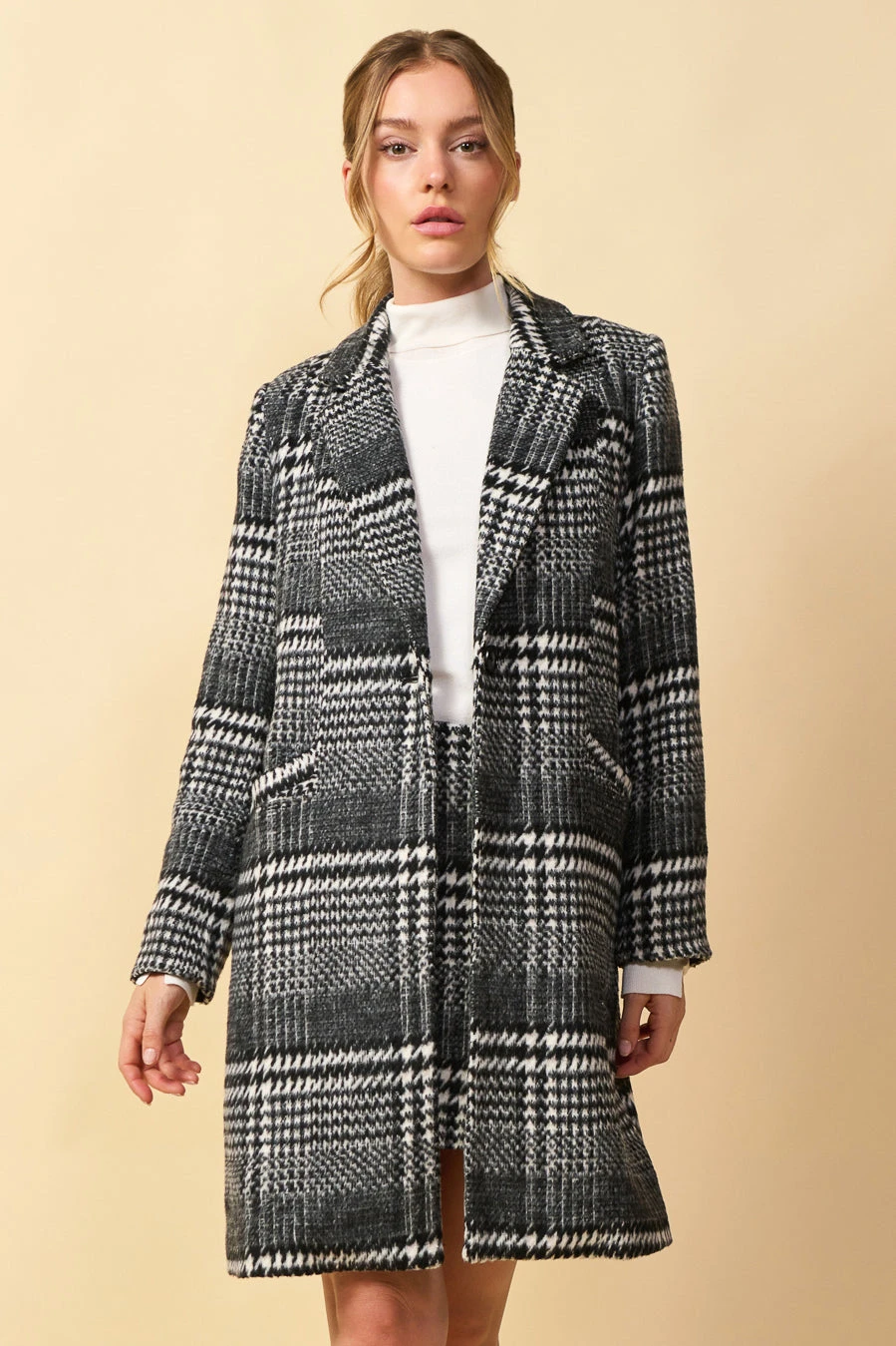This houndstooth coat is ready to slip on over all your cool-weather outfits this season. Closed by a single button at the front, it has notched lapels, concealed hip pockets, and a slightly relaxed fit for easy layering.