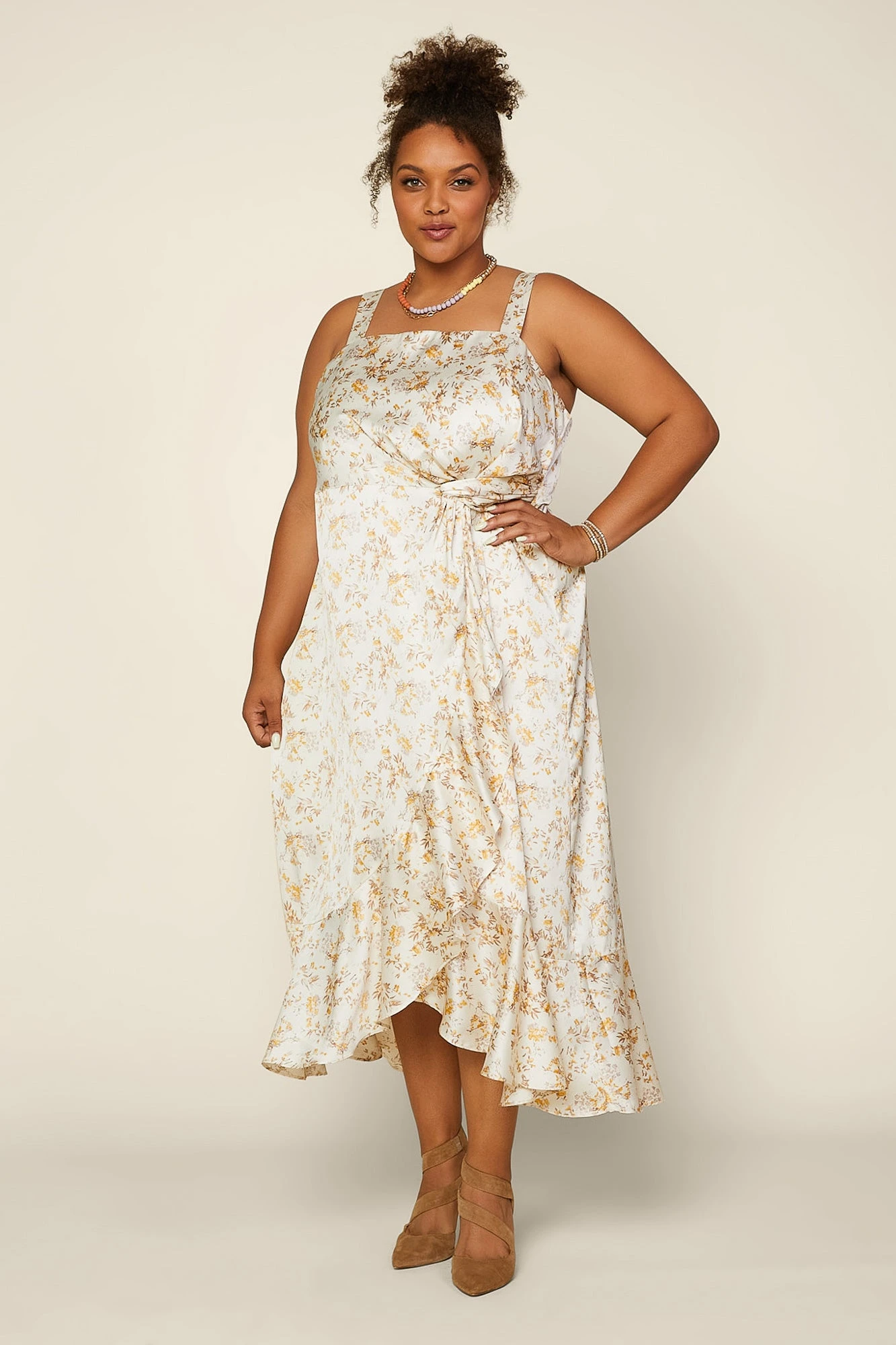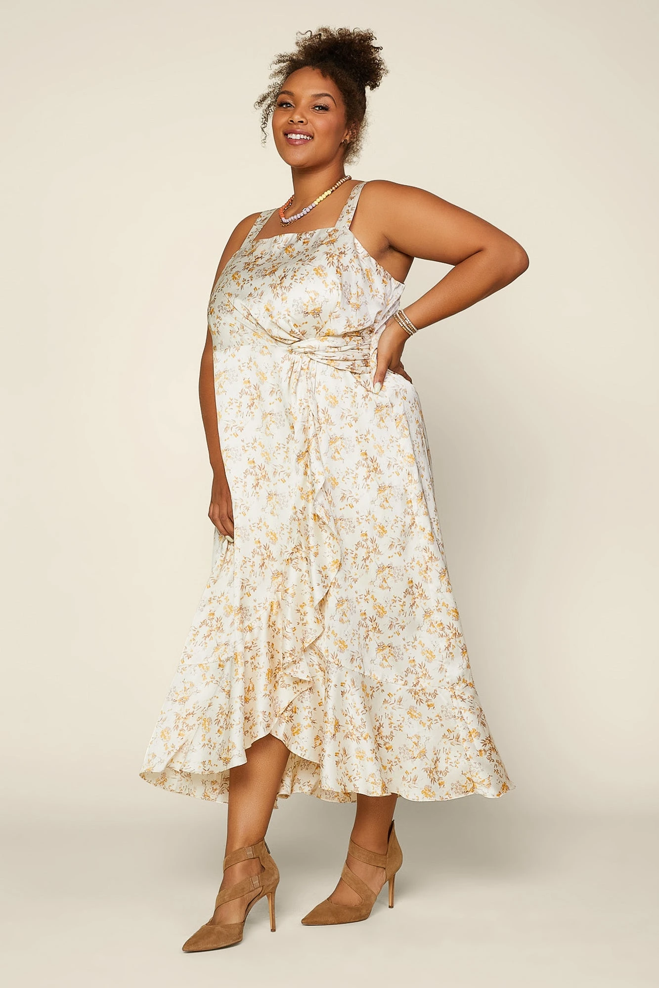 A twist on floral print. This square-neck dress has wide straps and a fitted bodice accented by a twist detail at the waist. It flows to a ruffled tulip hem, landing at the perfect shin-skimming length. A lovely choice for the season’s happenings.