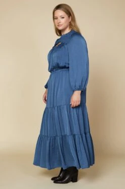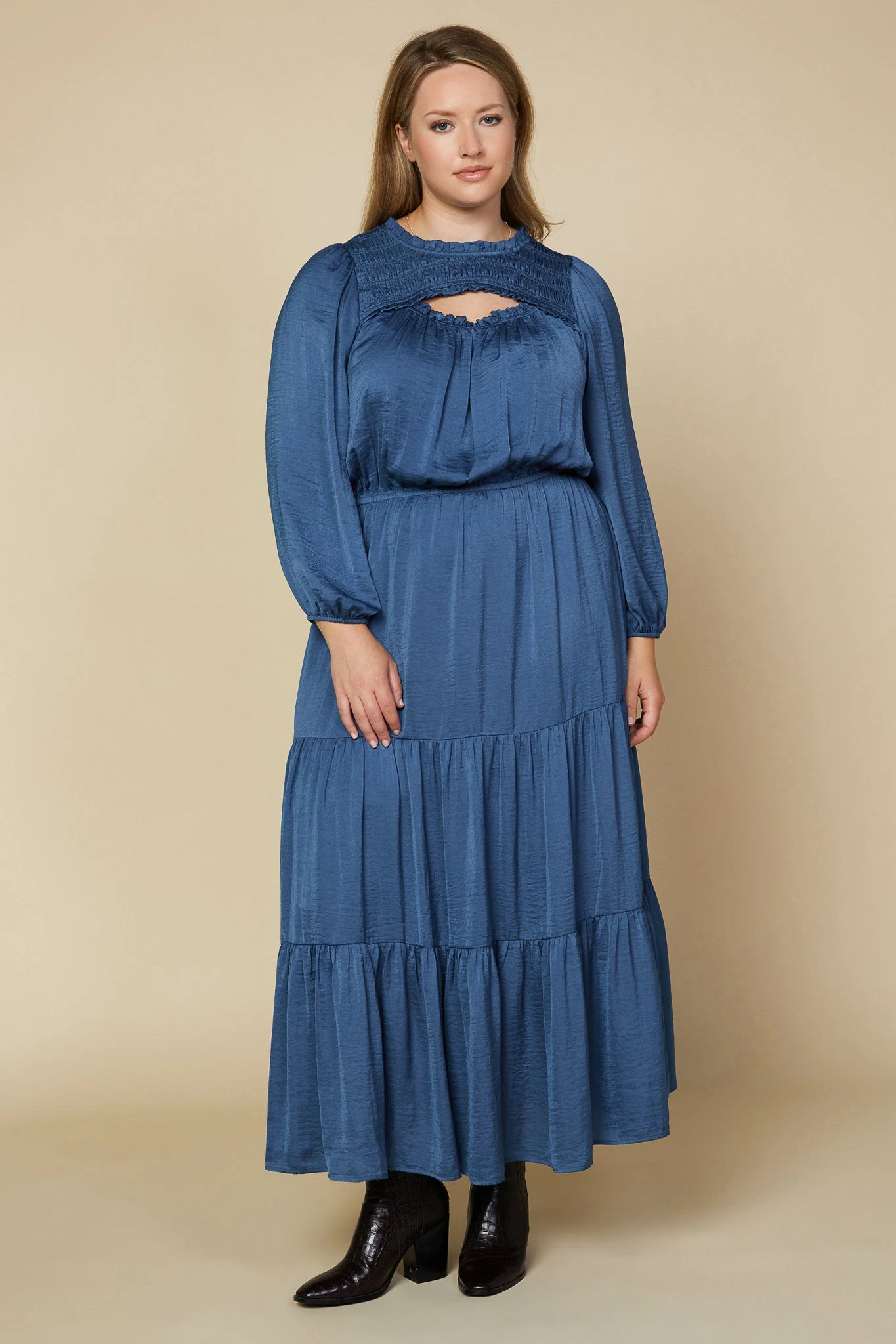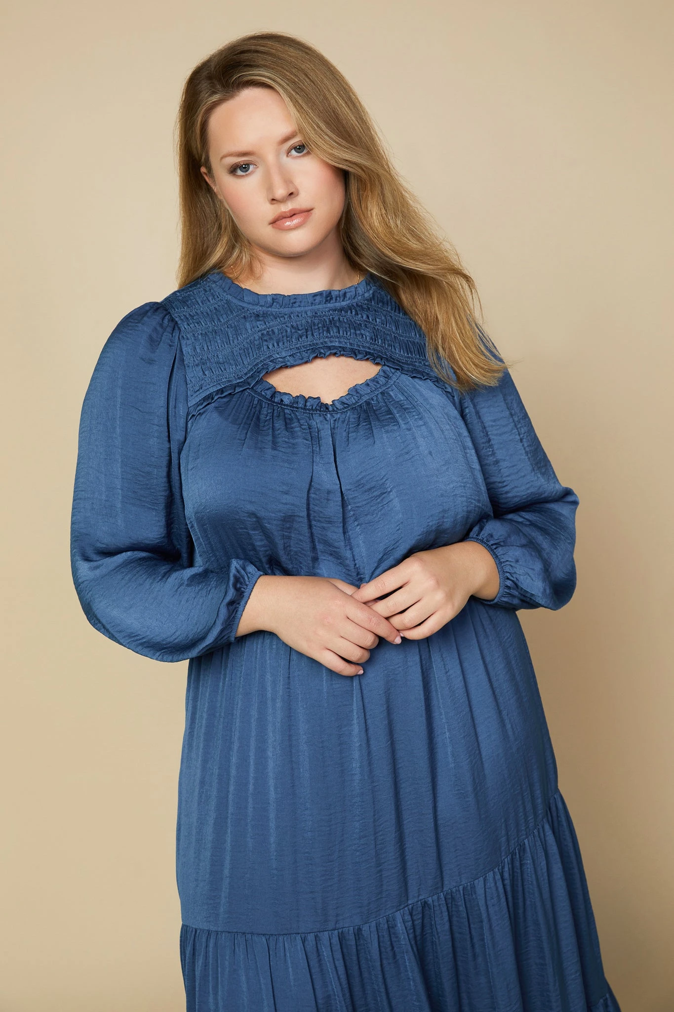 This long-sleeve dress stuns in a flowy silhouette detailed with smocked piecing, a peekaboo cutout, and a tiered hem. Featuring an elasticized waist that draws in the shape, it’s perfect for the festivities ahead. Finished with a keyhole at the back.