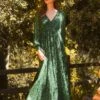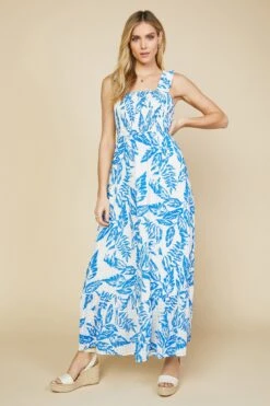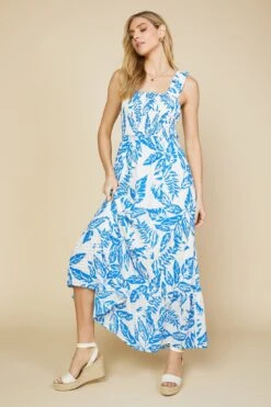 Printed with a textured leaf motif on a subtly sheer white check, this maxi dress has ‘beach getaway’ written all over it. The floor-sweeping style is both comfortable and pretty—it has gathered straps, a smocked bodice, and a ruffled hem.