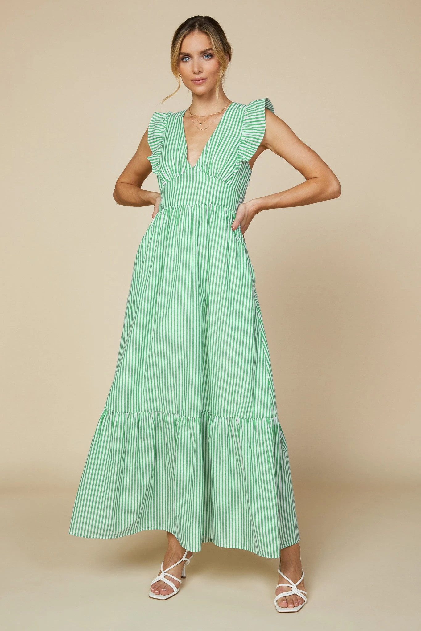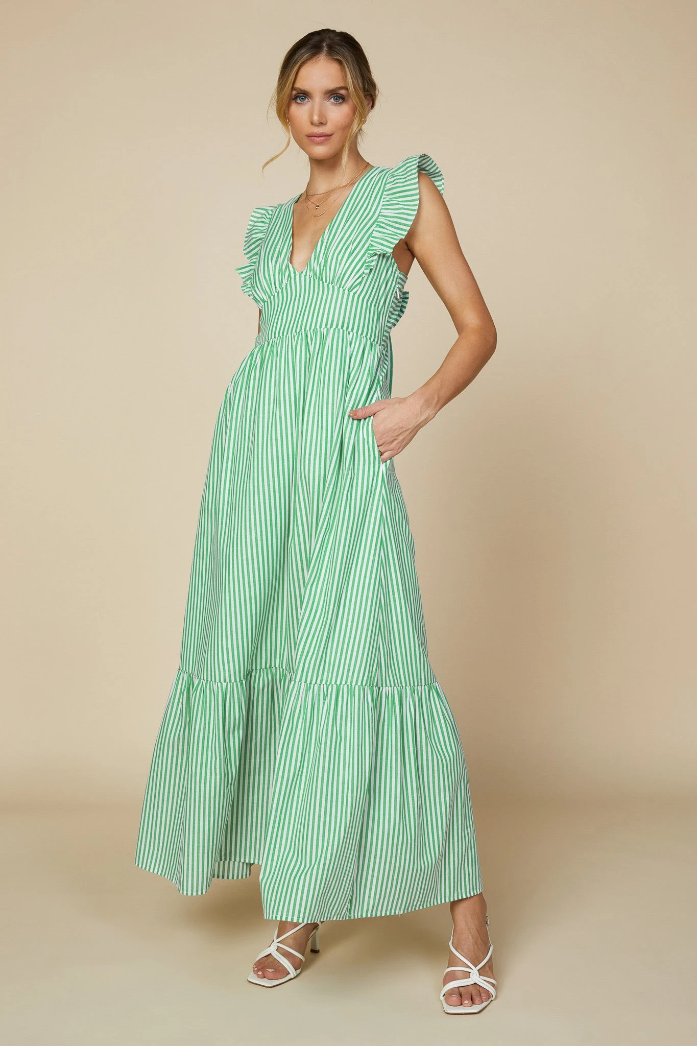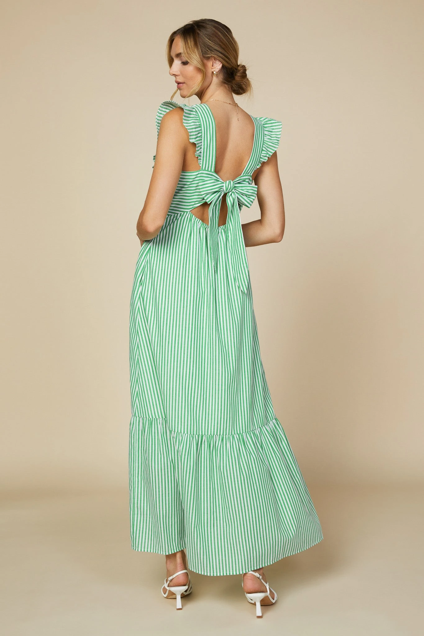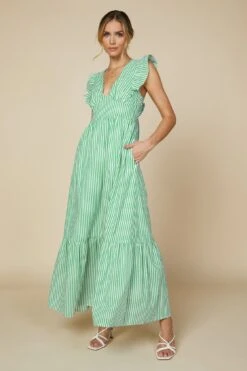 These stripes accentuate the ankle-grazing silhouette of this ruffled maxi dress. Featuring an alluring cutout back that ties into a bow, it’s just right for soaking up the sunshine on warmer days. What makes it even better? Hidden pockets, naturally.