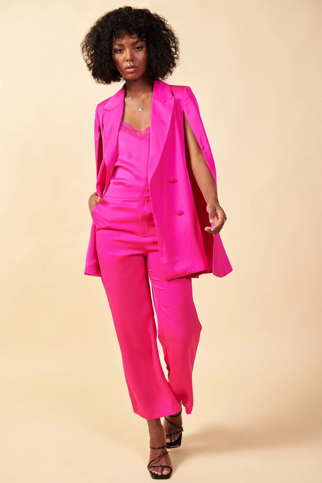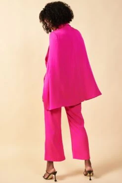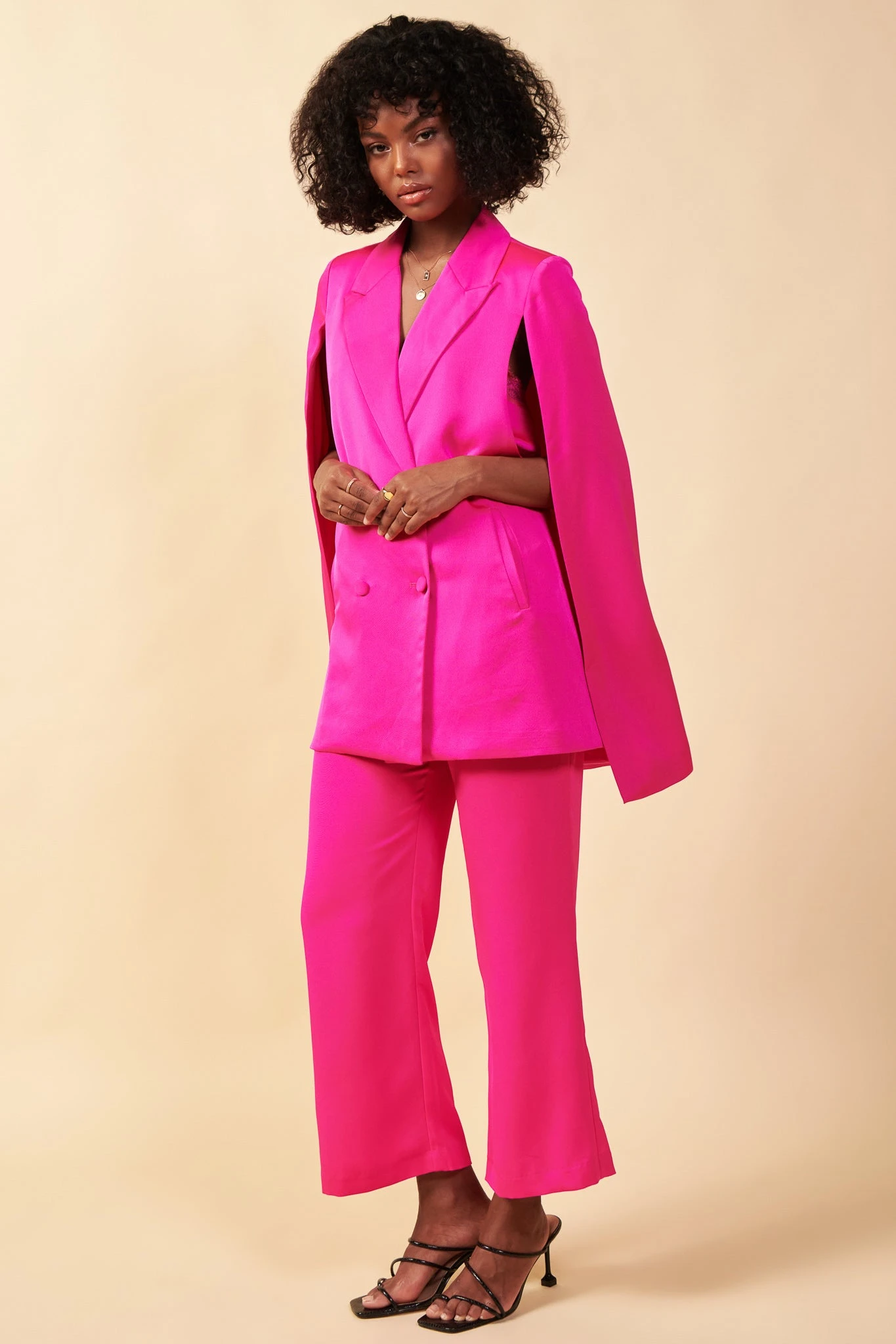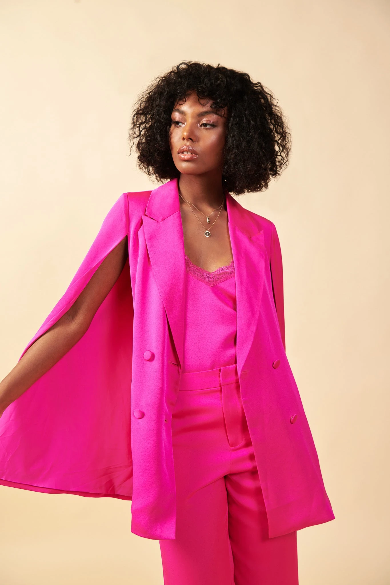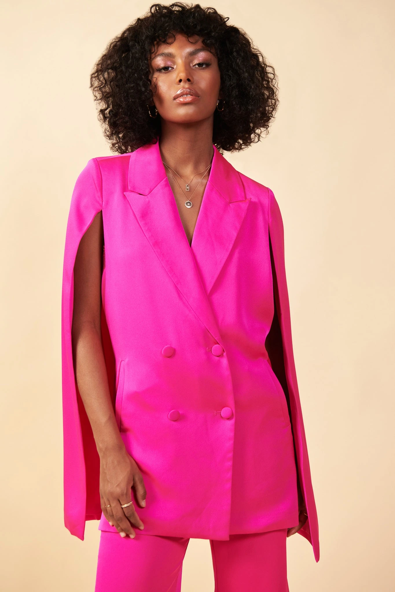 This double-breasted satin cape takes the foundation of a classic tailored jacket and drapes it over the shoulders for a modern look that’s polished and sophisticated. It’s designed with peaked lapels, covered buttons, and welt pockets, plus slits at the sides.