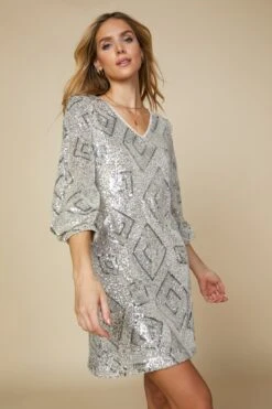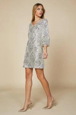 Covered in thousands of glimmering silver sequins, this dress is made to be the life of the party. It’s just so much fun, shining bright in a playful diamond pattern.