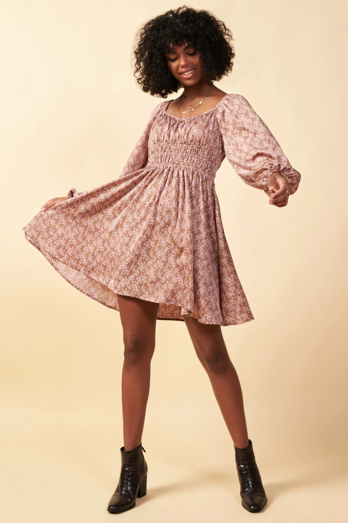 Prepare to be flattered. With its sweetheart neckline and smocked waist, this floral-print mini dress is guaranteed to get compliments wherever you go.