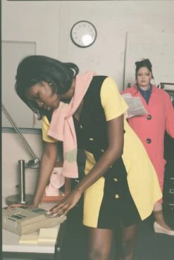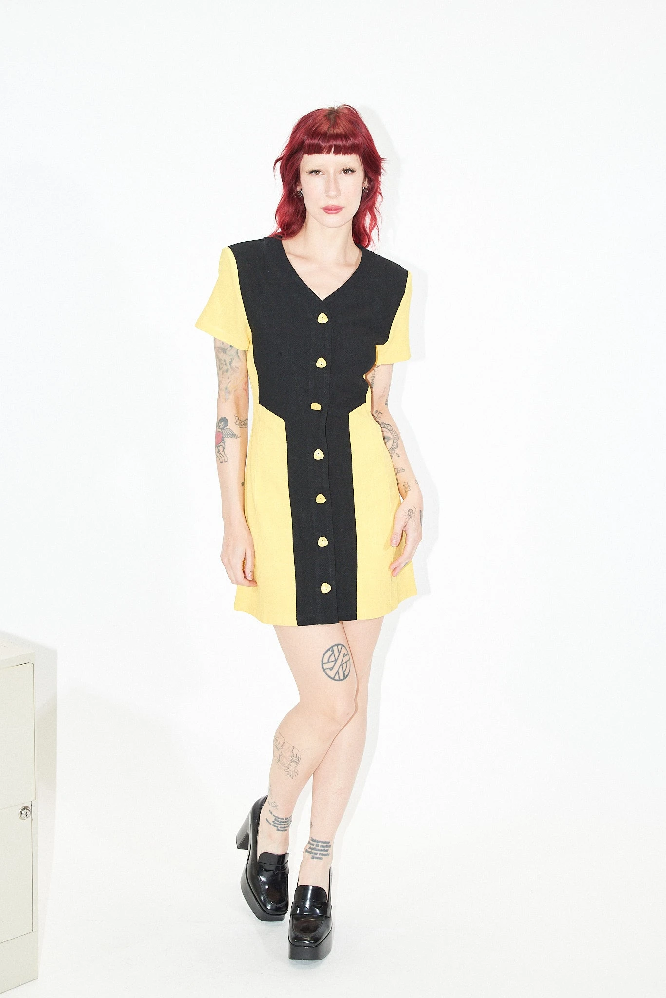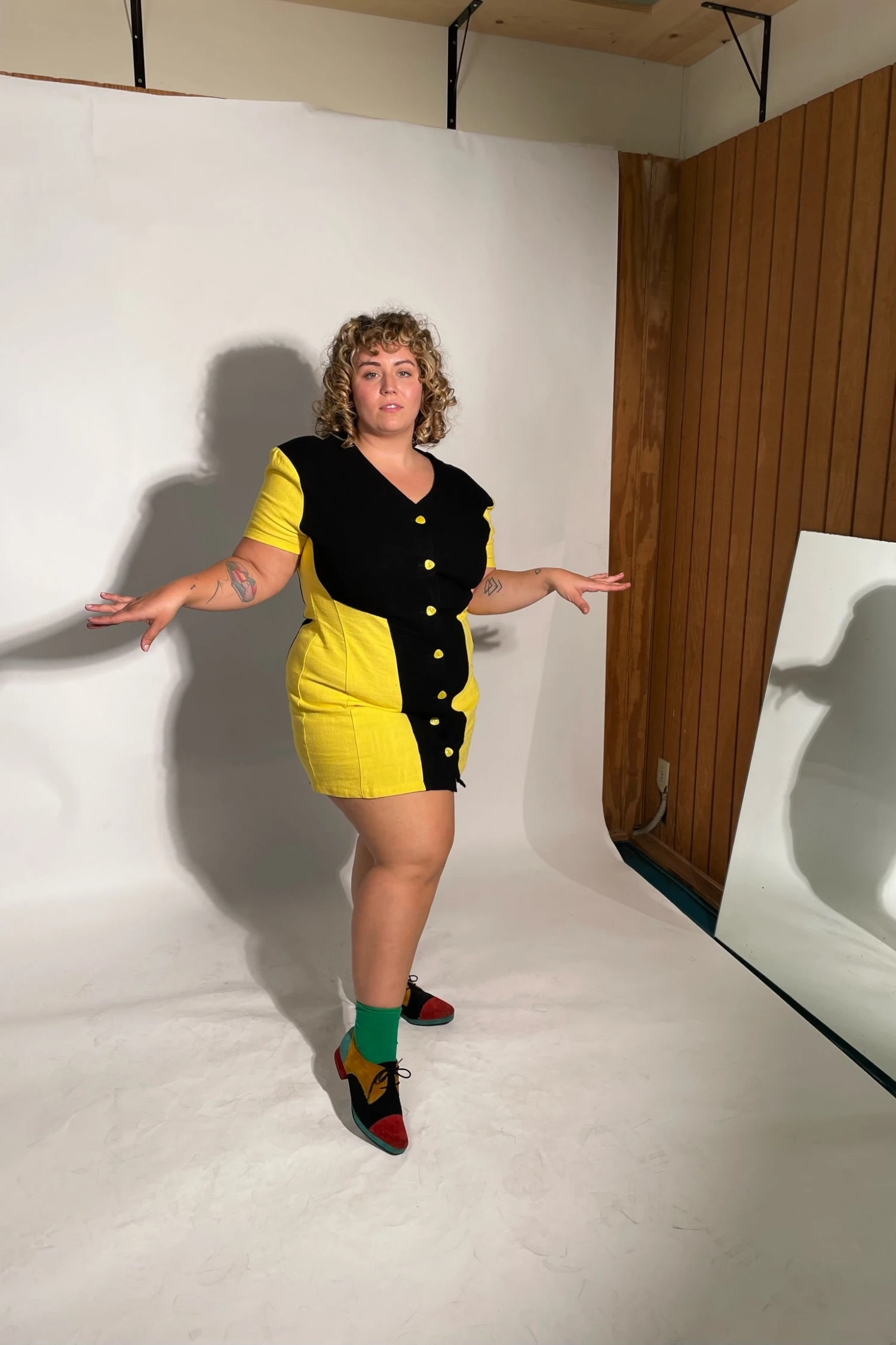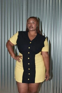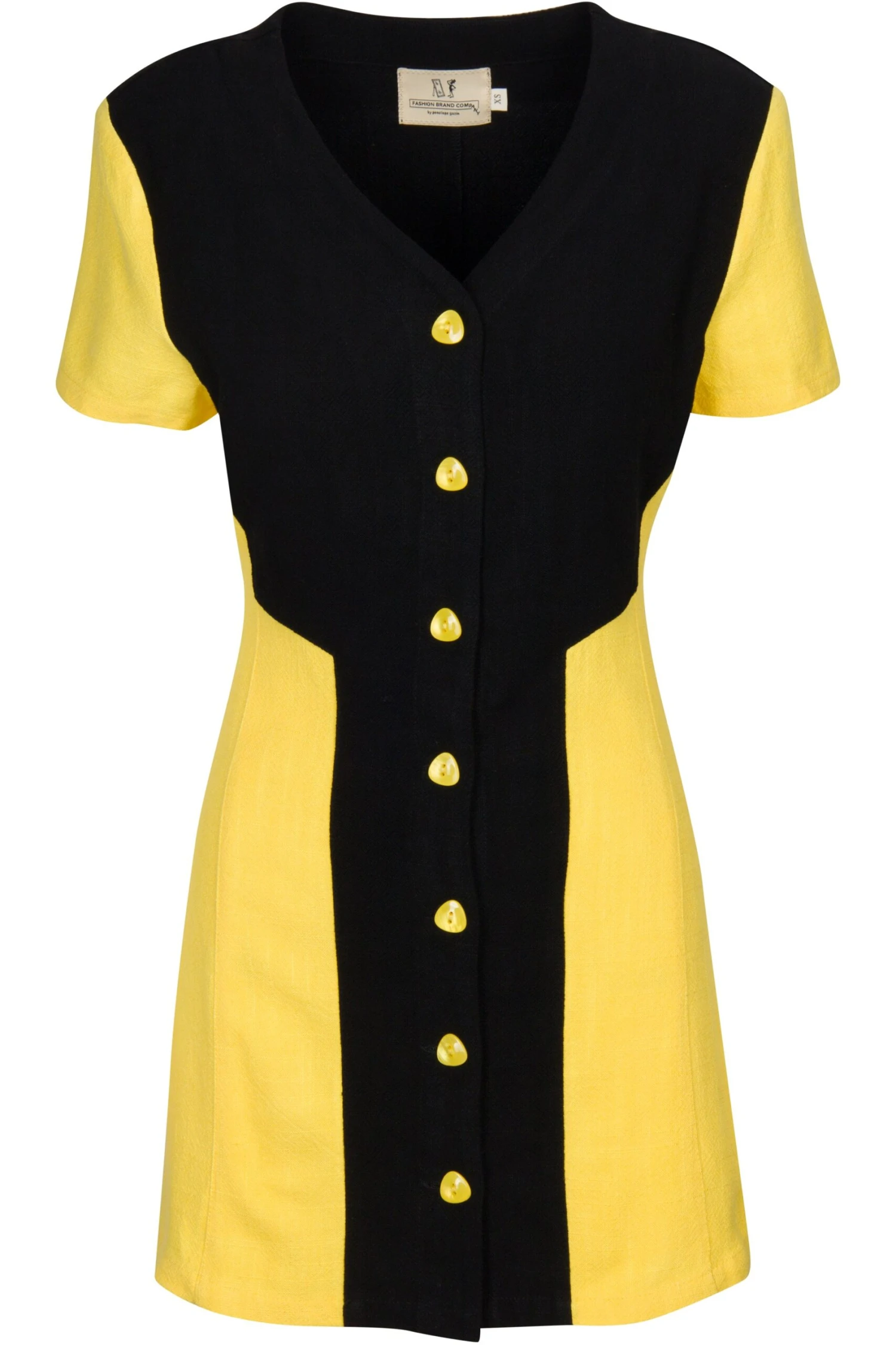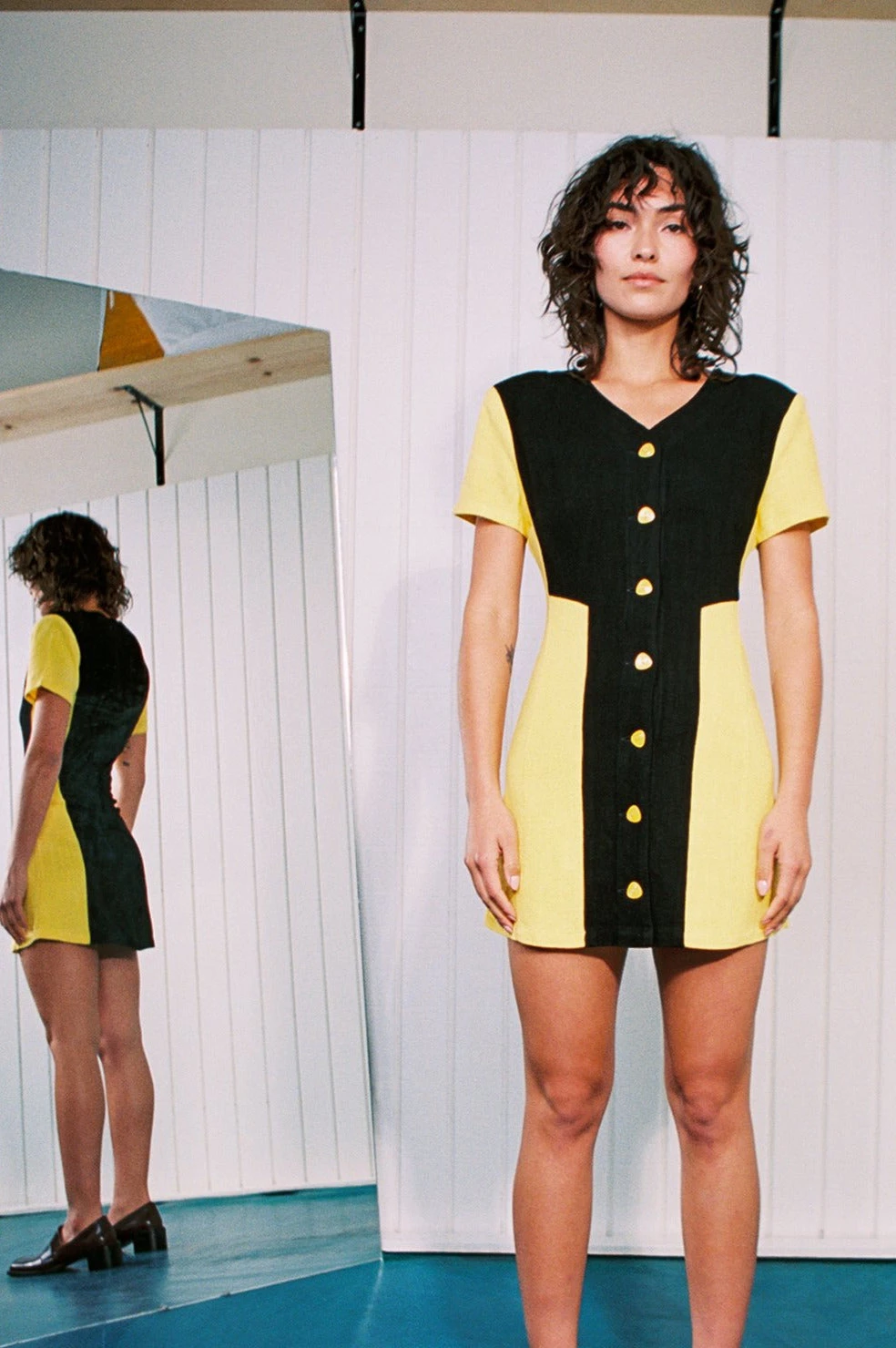 In nature aposematism is used to advertise danger to others. In fashion, it also means the same. Send warning signals throughout your day in this beautifully constructed linen dress with custom yellow rounded triangle buttons and subtle shoulder pads to make you look buffer than you are actually are.