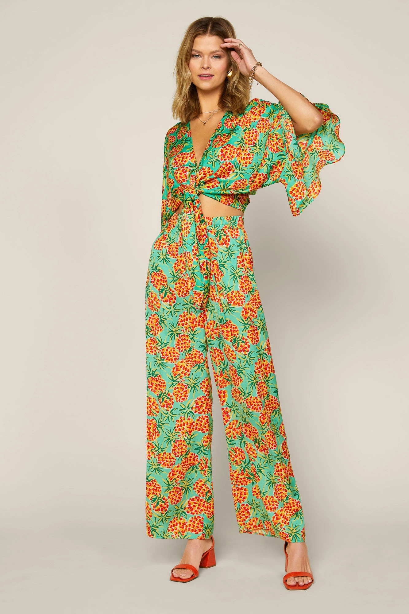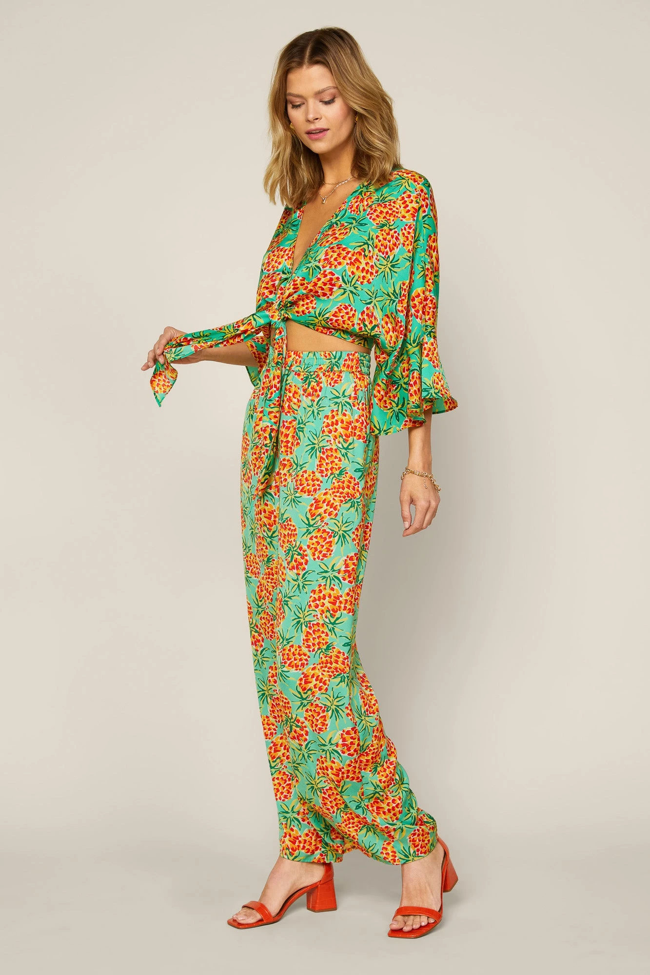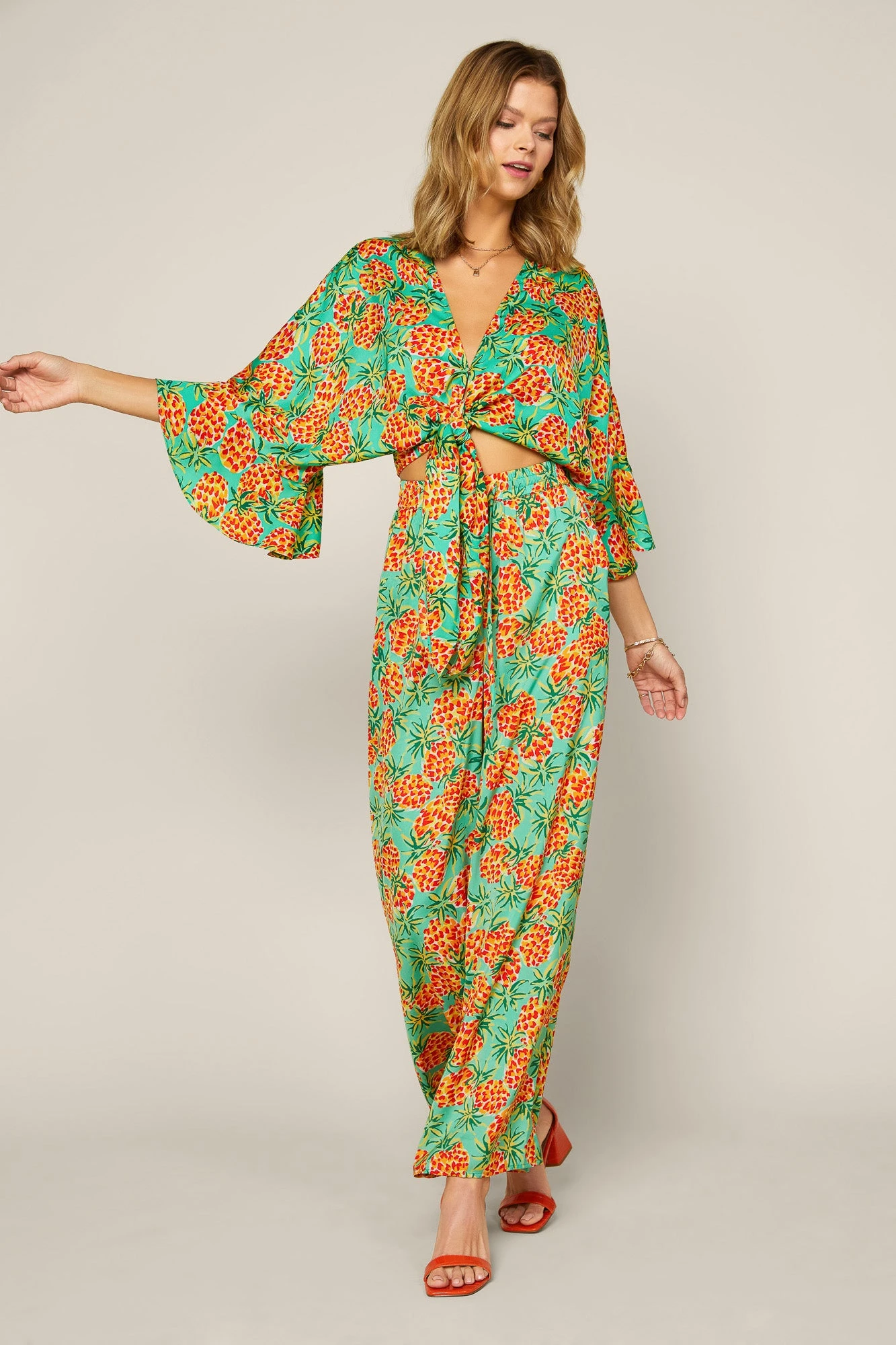 Lightweight and roomy, these pineapple-print palazzo pants feature a pull-on design that make the pair a cinch to wear. They’ve got a comfortable elasticized waistband and an adjustable drawstring, plus two handy pockets at the front.Â