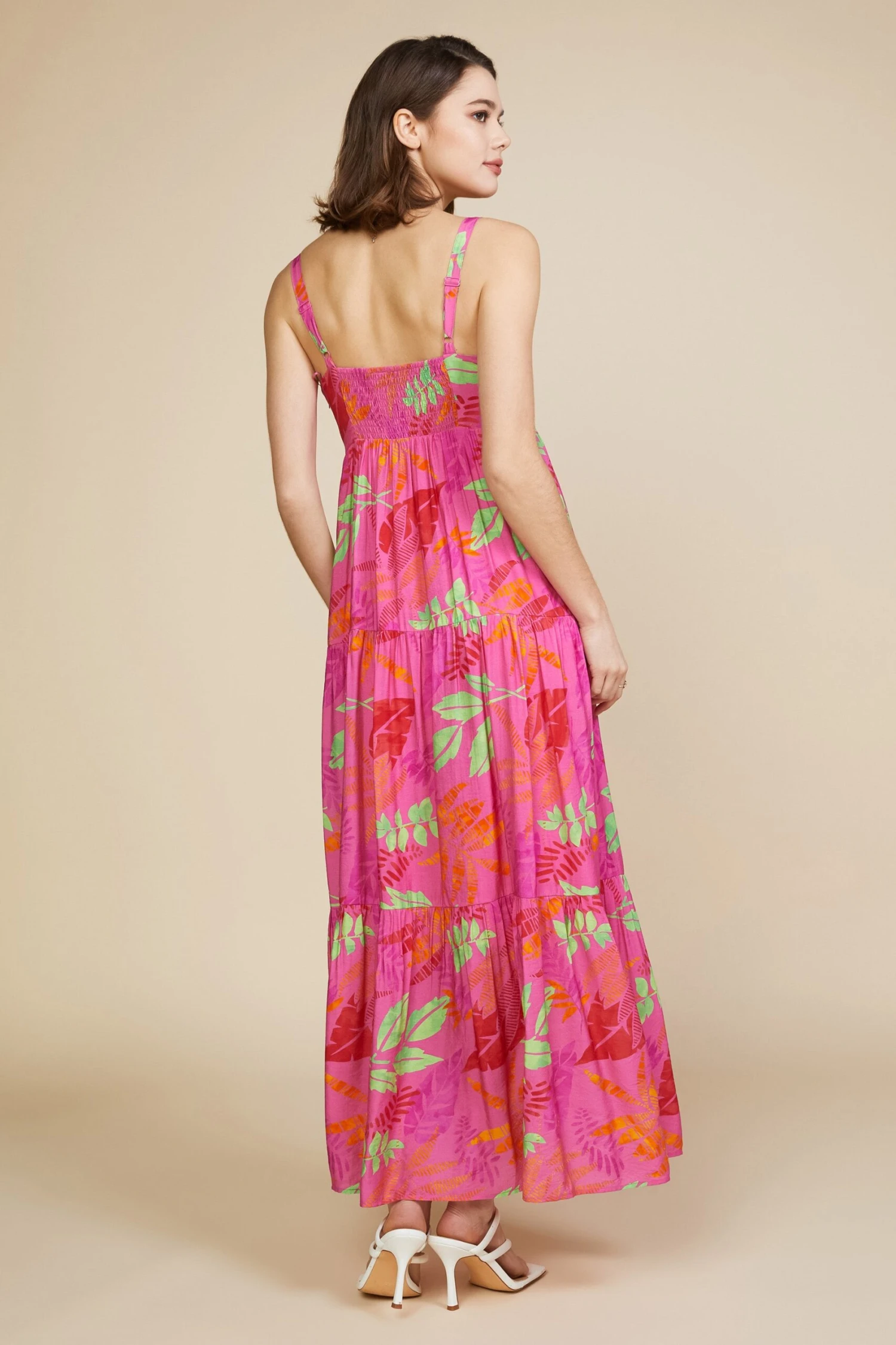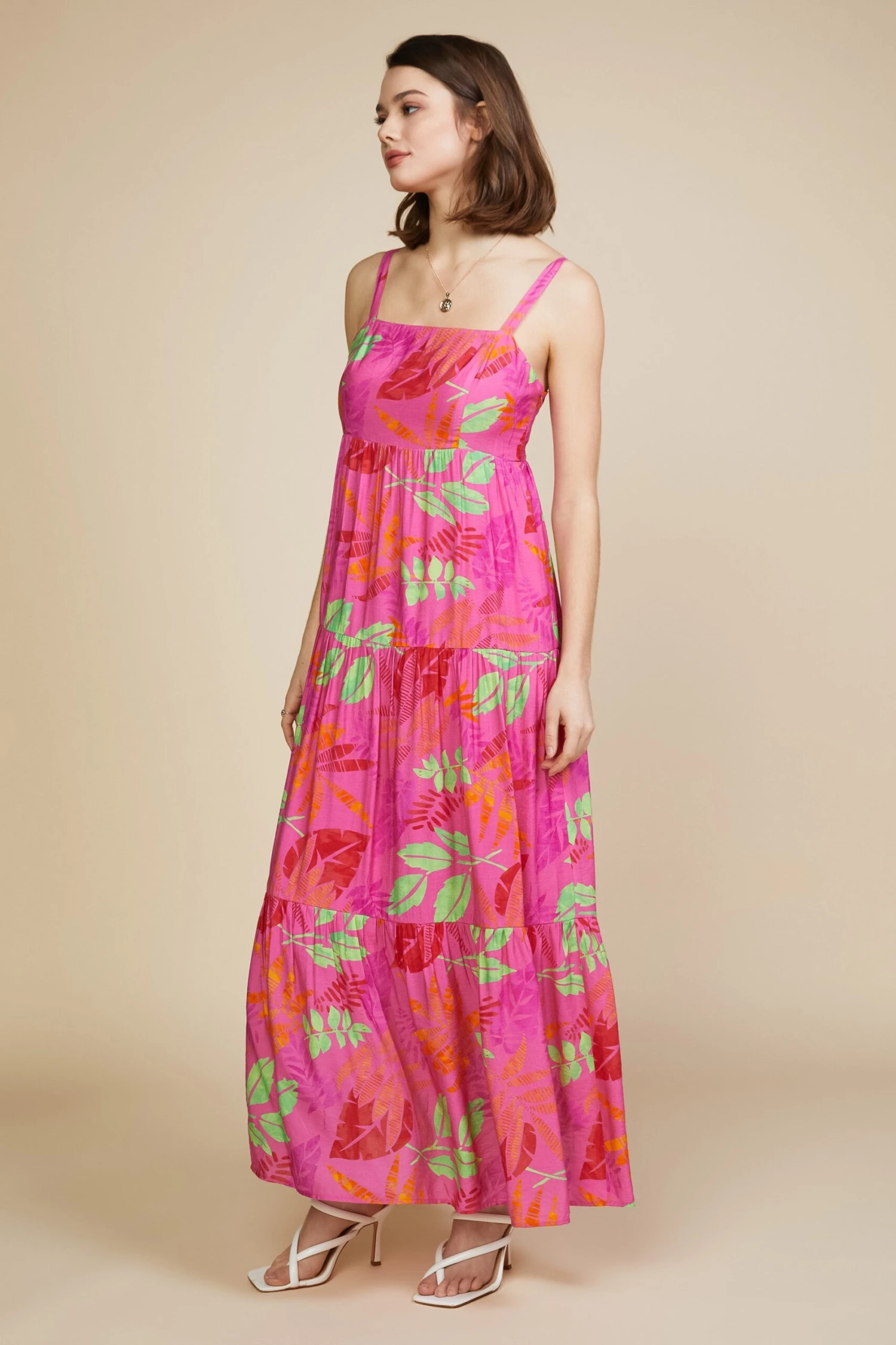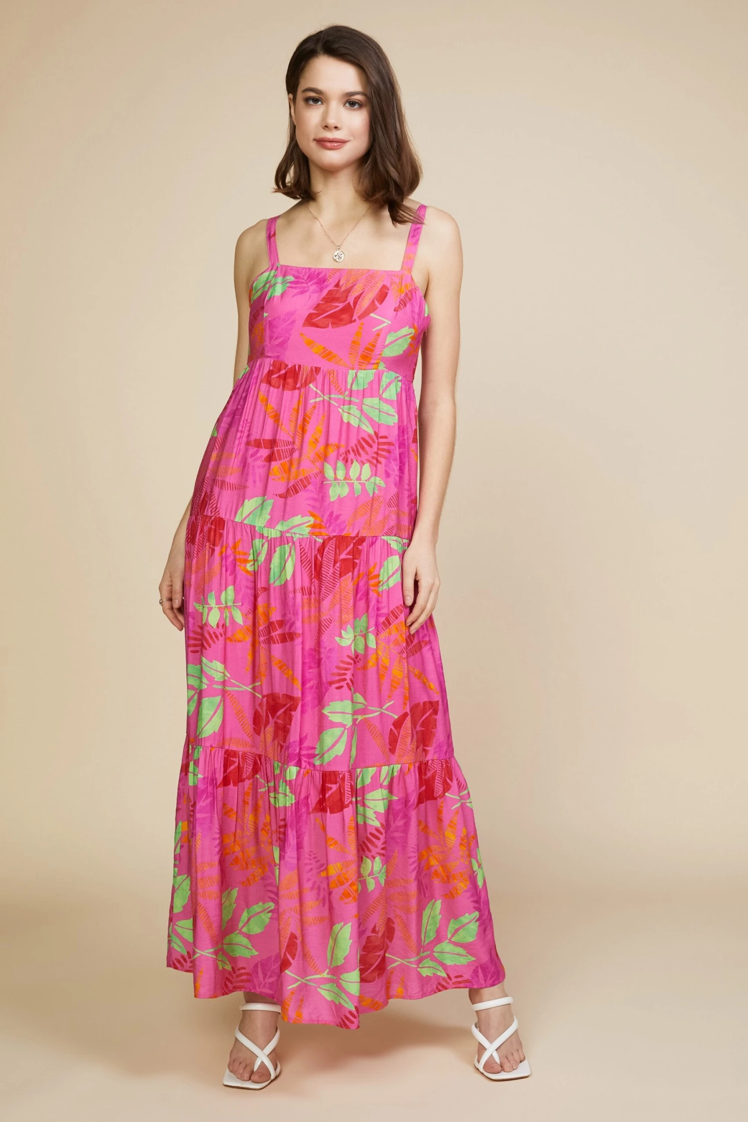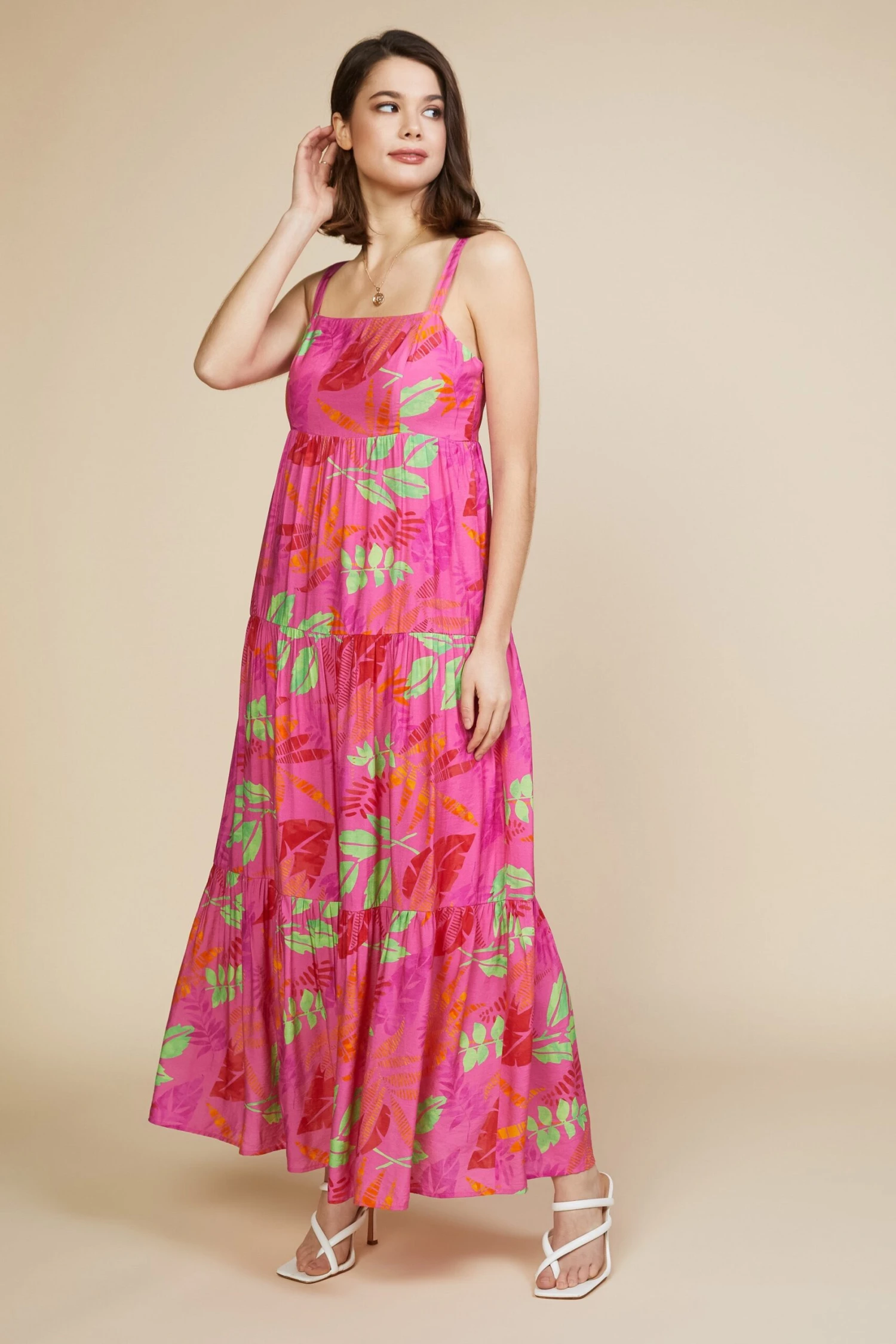 This tropical-print maxi dress will have you dreaming up your next getaway. The tiered style is bright and strappy, comfortably fitted by smocking at the back before dropping to a floor-skimming hem.