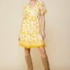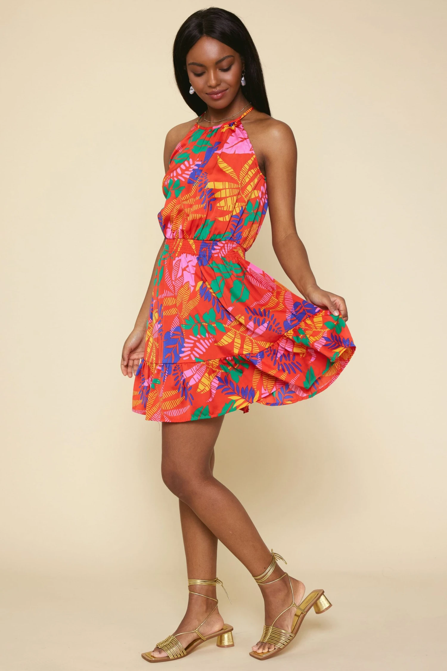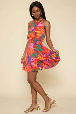 Bright idea. Done in a tropical print of bold, juicy colors, this mini dress is a playful stunner that’s impossible to ignore. It’s got a halter neckline, elasticized waist, and a ruffled hem.