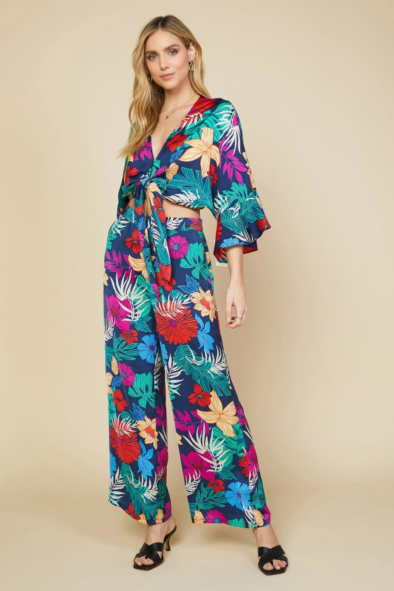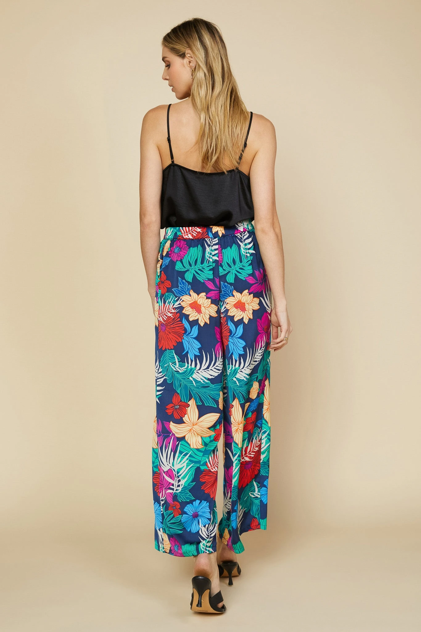 Vacation bound? Take these tropical-printed palazzo pants along for a sartorial statement. The pair slips on with ease and sits comfortably high on the waist, cut for a breezy wide-leg silhouette. Add our matching crop top to amp up the drama, or take the simple route with a minimalist tank and flat sandals.