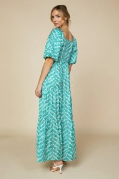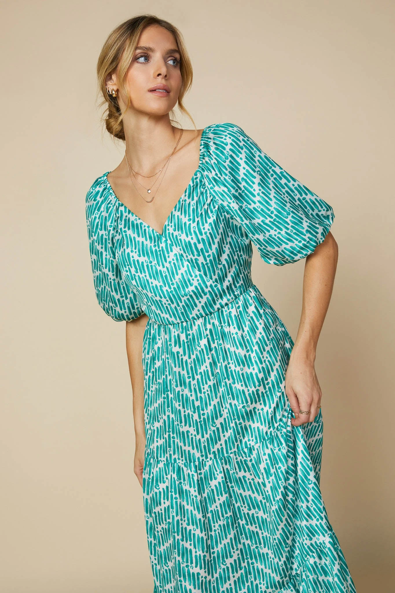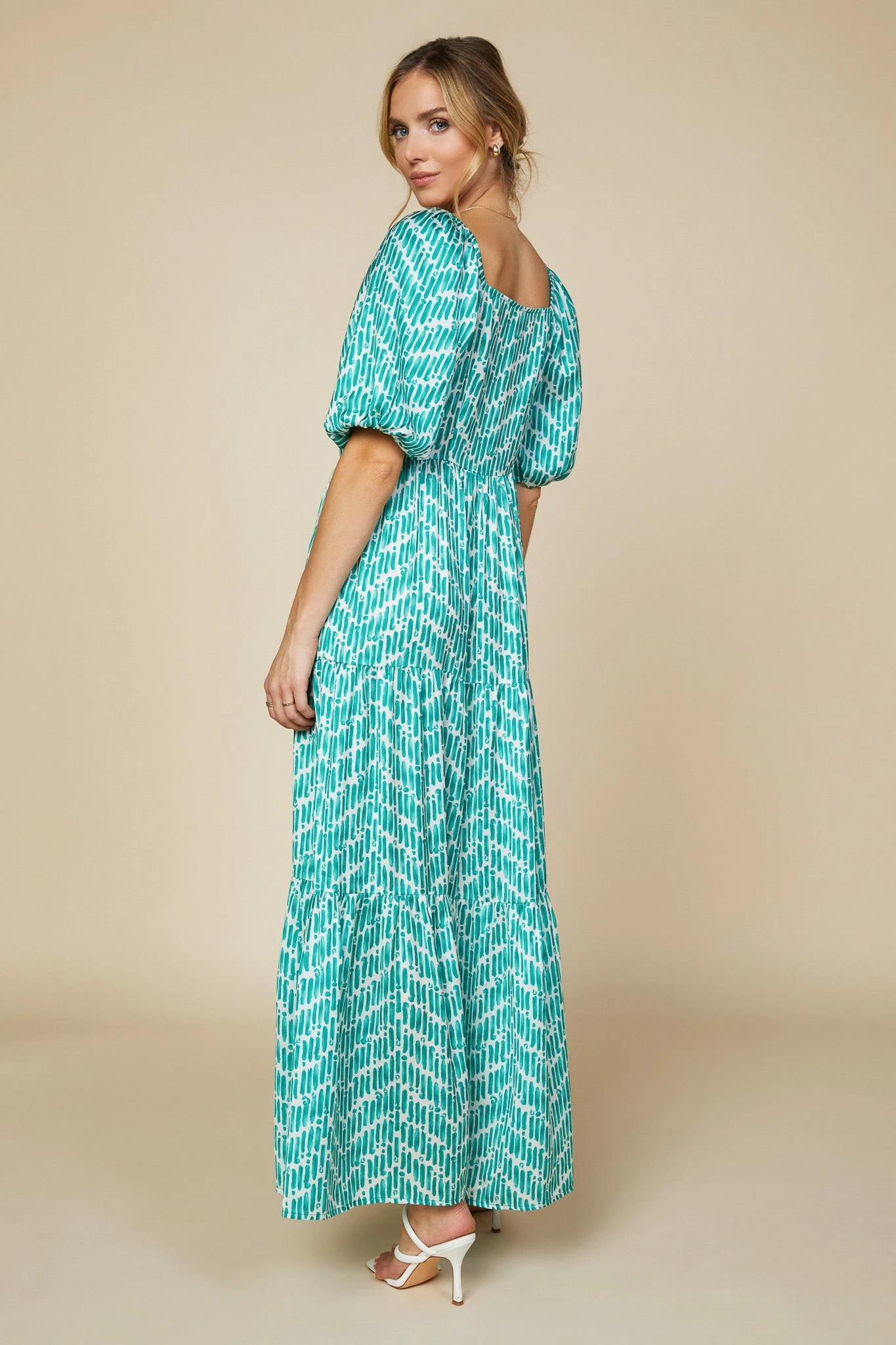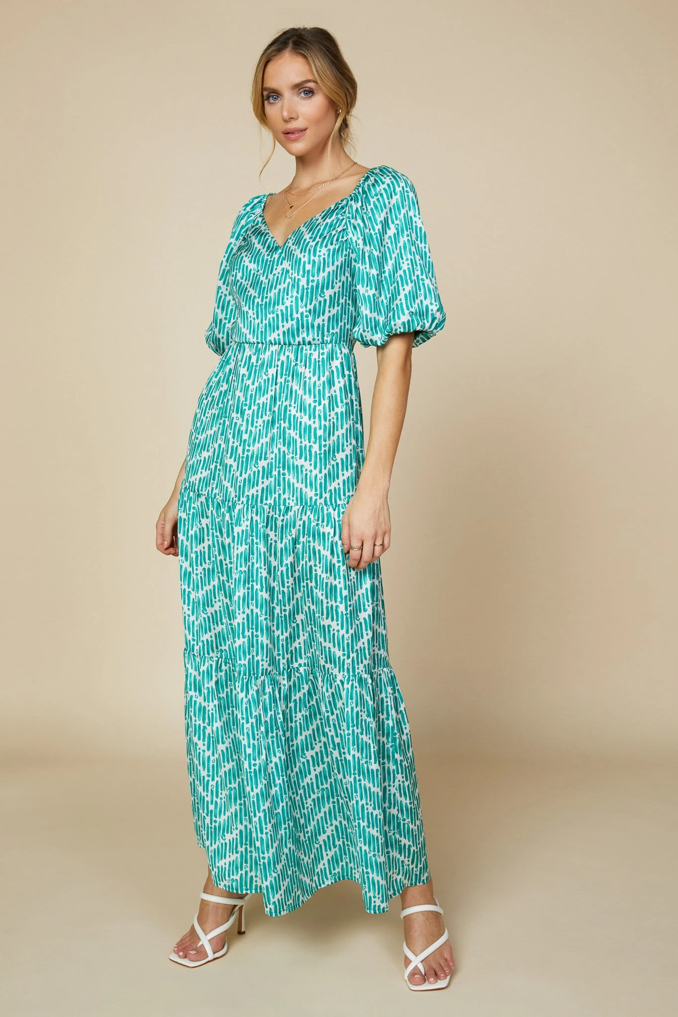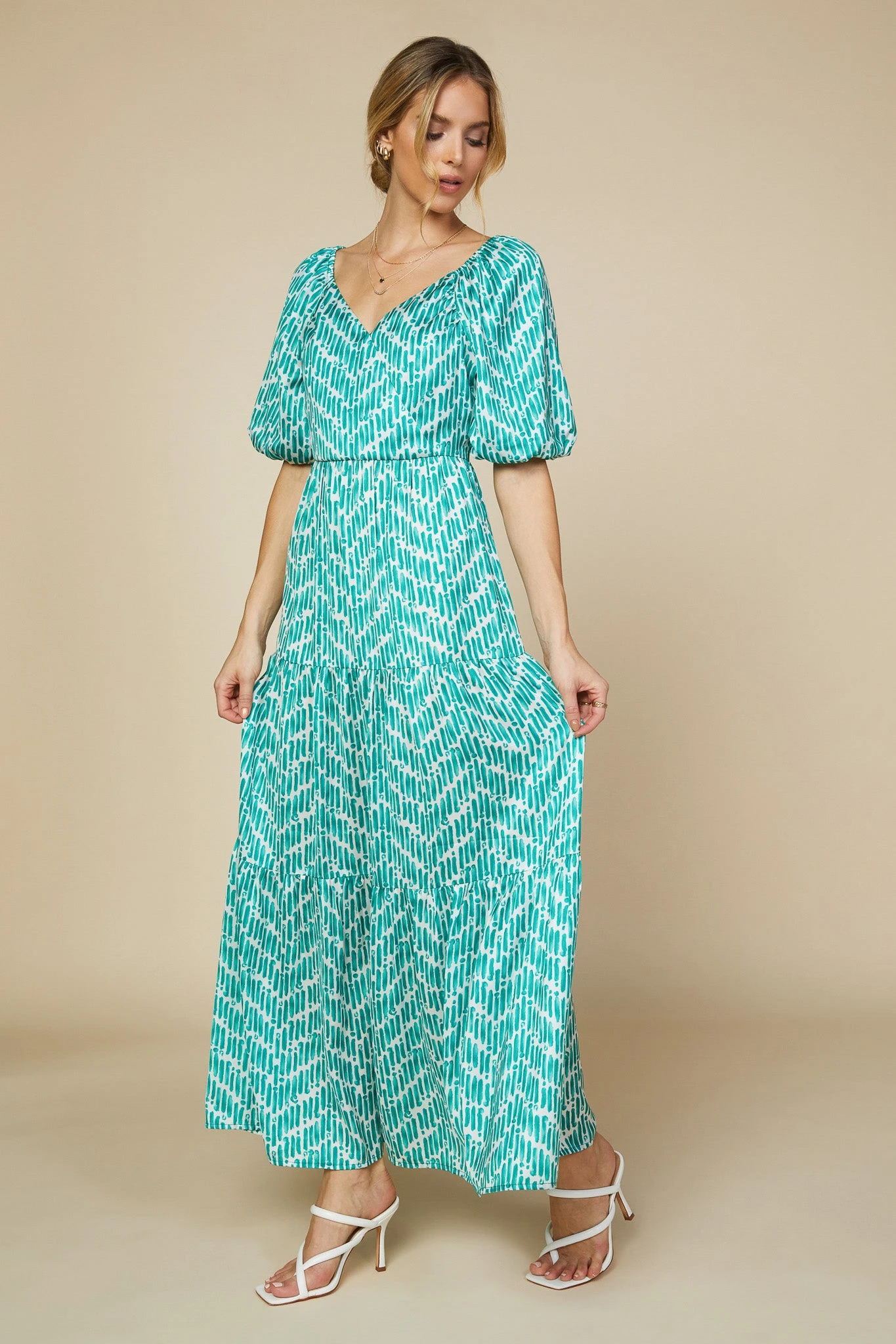 This Watercolor Chevron maxi dress is defined by its flattering surplice-style bodice, voluminous puffed sleeves, and flowy tiered skirt. Pretty and effortless—a flawless combination.