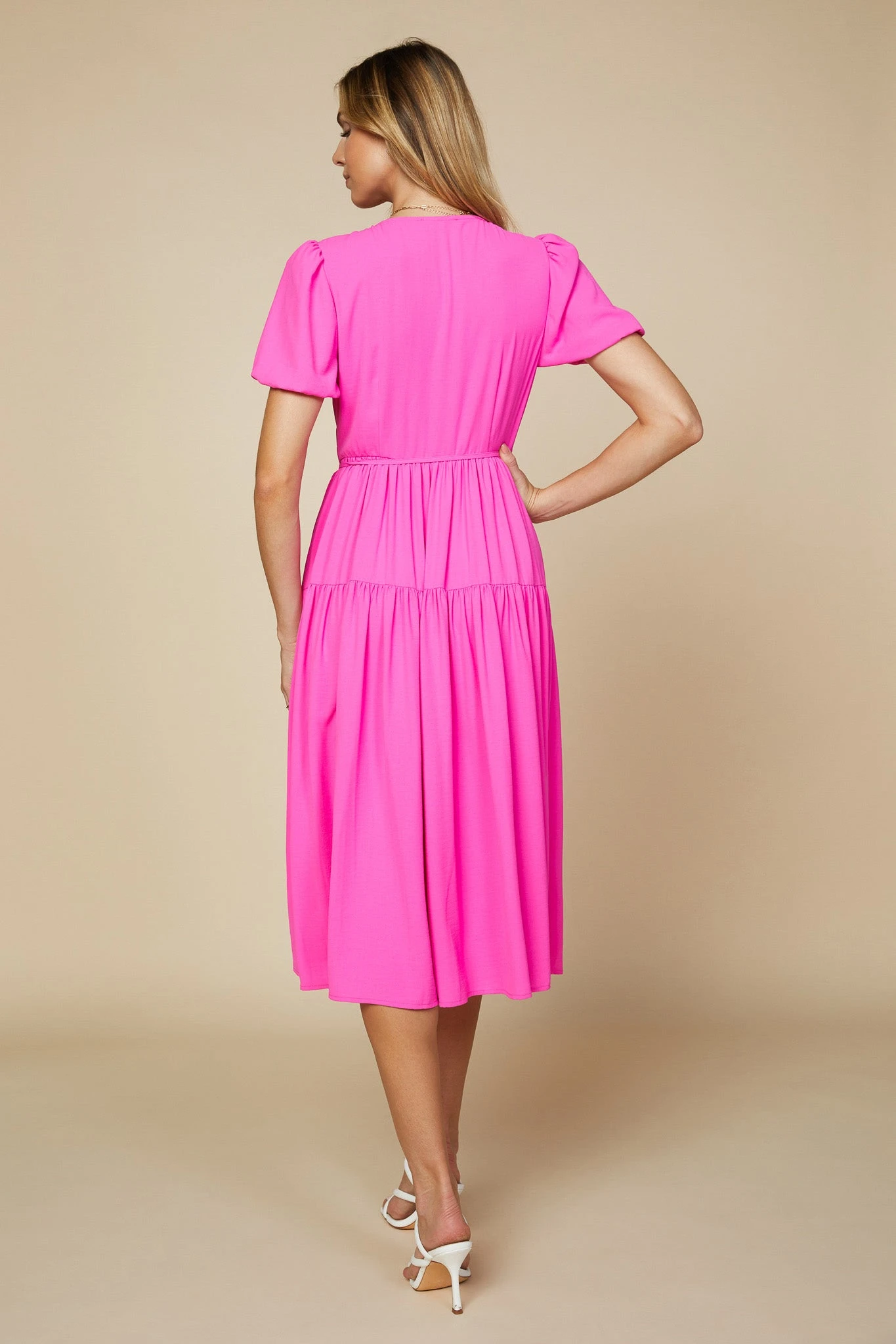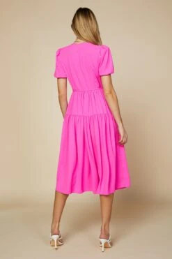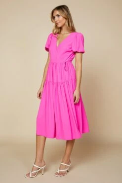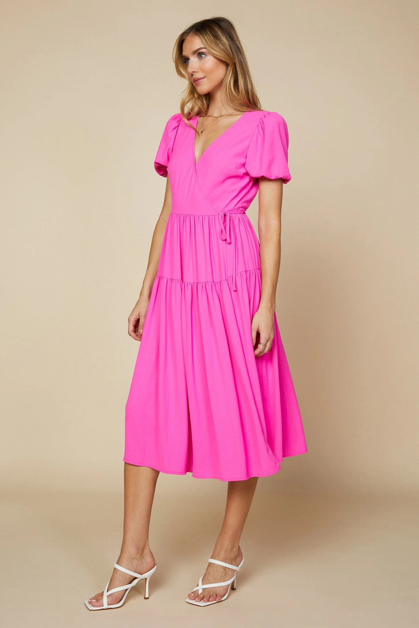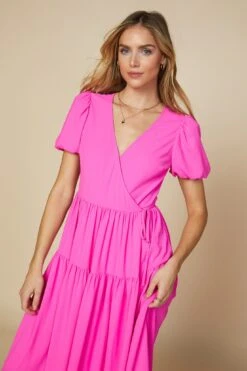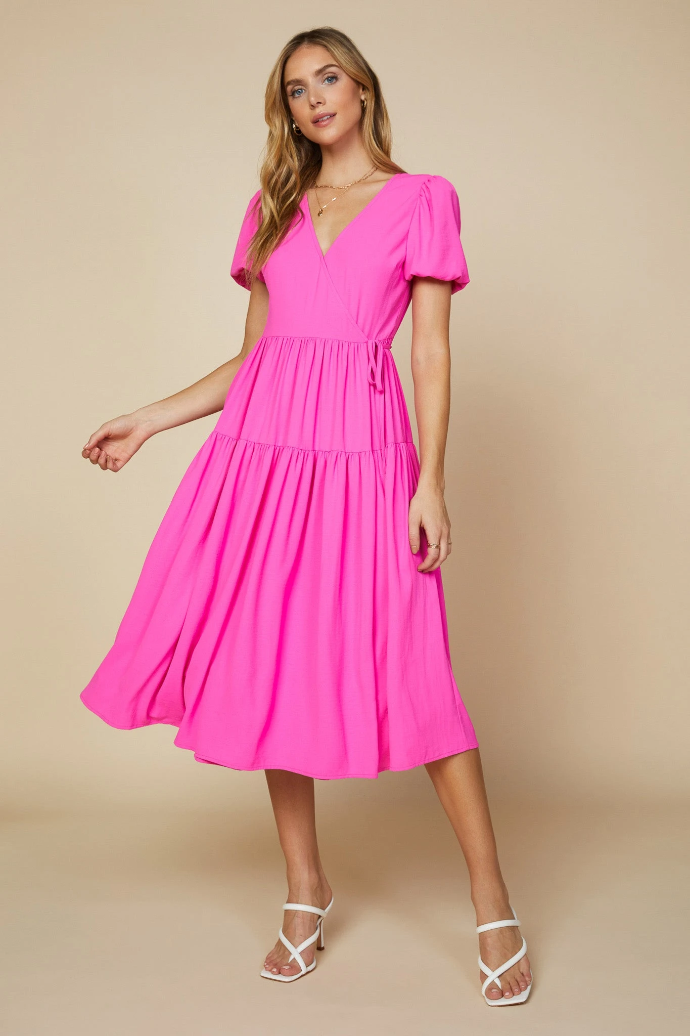 Puffed sleeves, wrap styling, can’t-miss-it shade of bright pink—this dress has all the makings of a favorite. It’s gathered at the waist and ties at the side before falling to a shin-skimming hem.